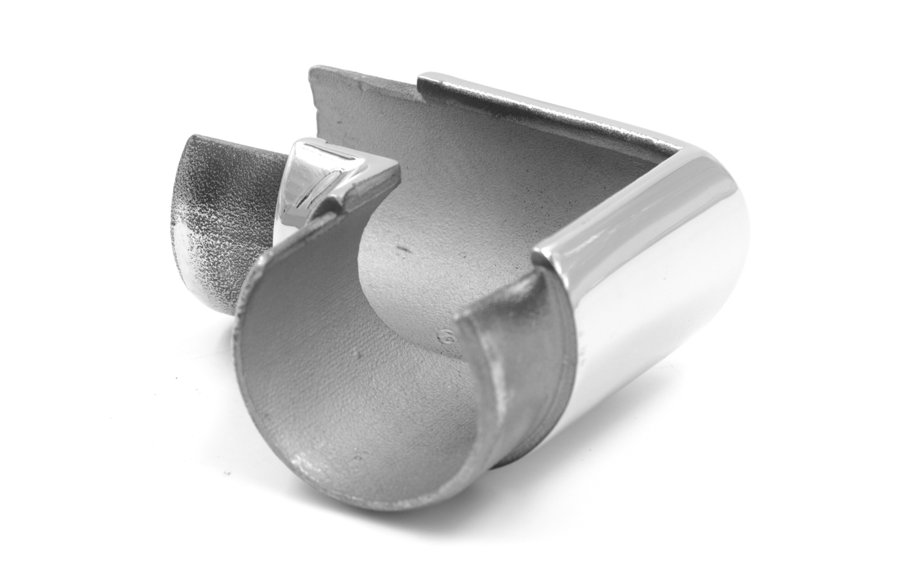 Фитинг предназначен для поворота поручня самосборных ограждений с несущим стеклом под углом 90 градусов в горизонтальной плоскости.