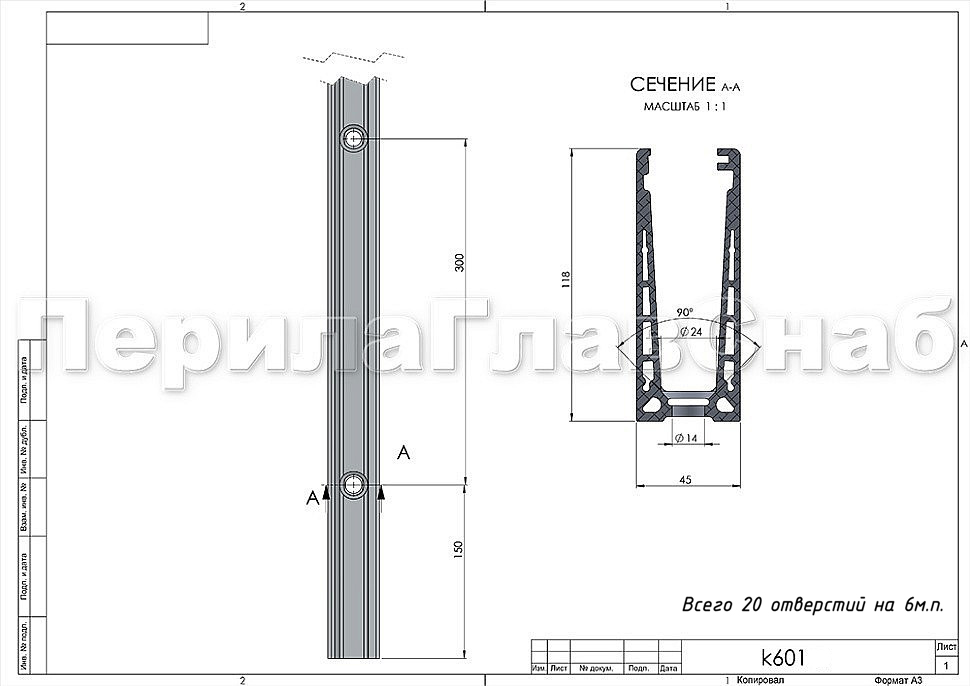 k601 — профиль для ограждений на несущем стекле ( для стеклянных ограждений). Алюминиевый профиль чаще всего используется при строительстве таких объектов, как торговые дома, бизнес-центры, отели, спортивные сооружения. Максимально допустимая высота ограждения может доходить до 1200 мм, боковая нагрузка – до 430 кг.