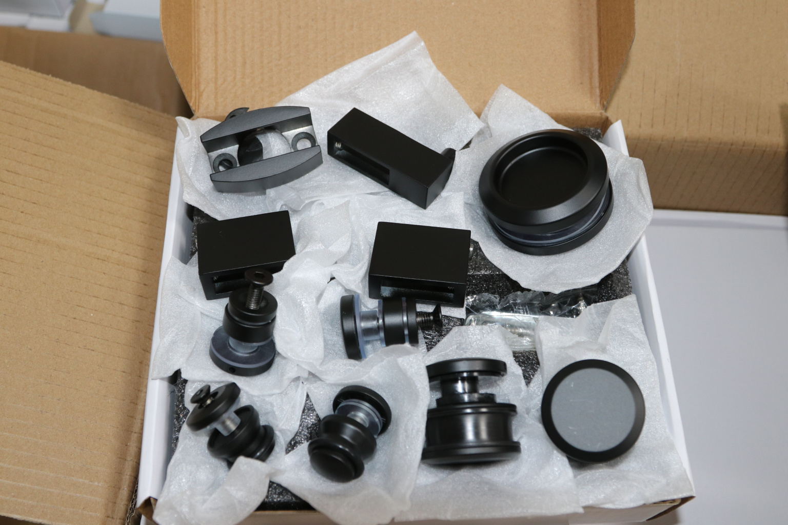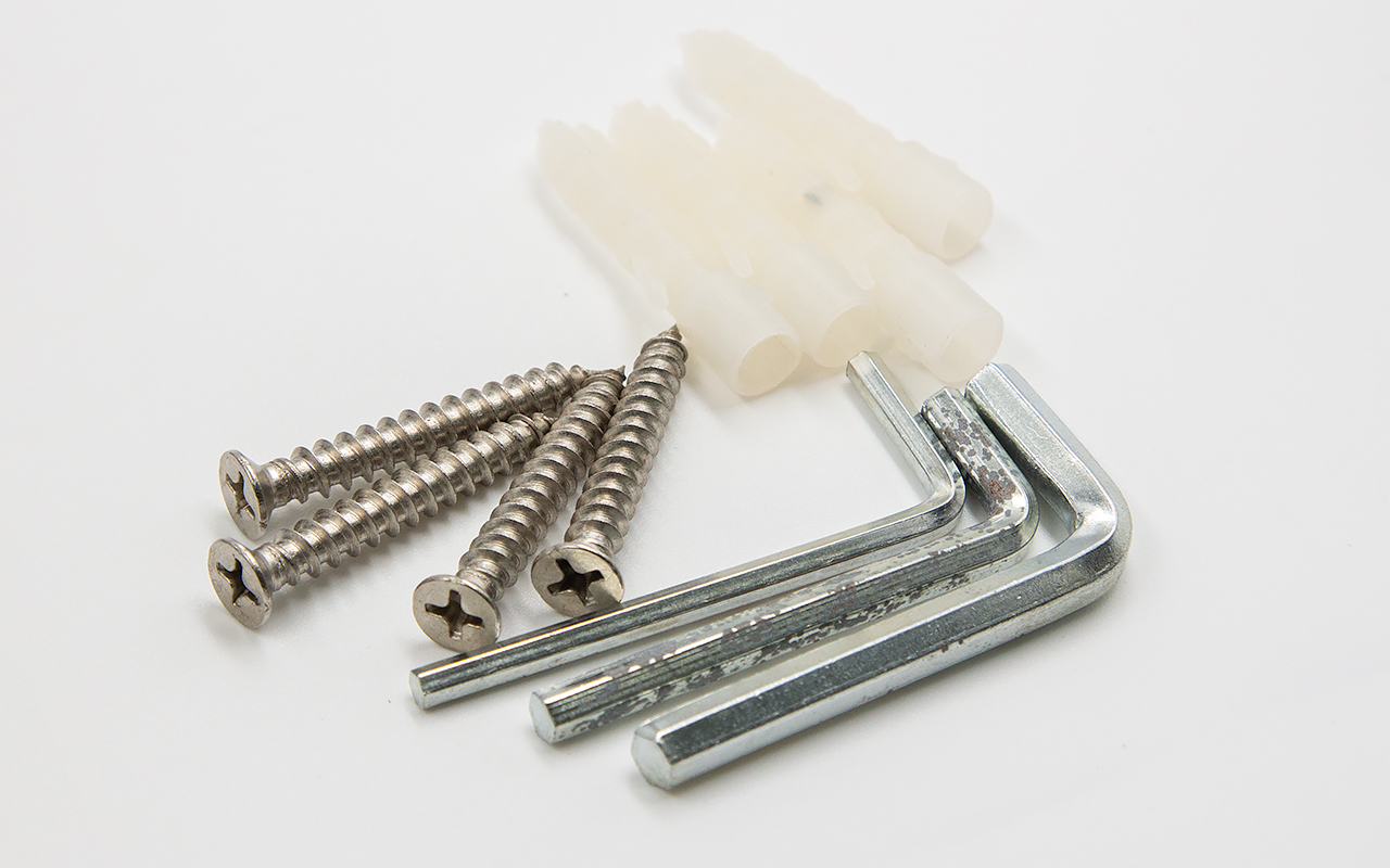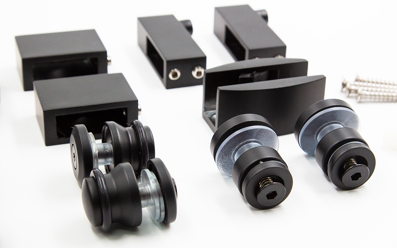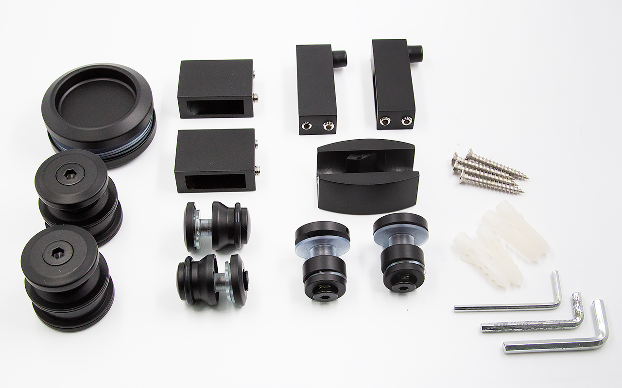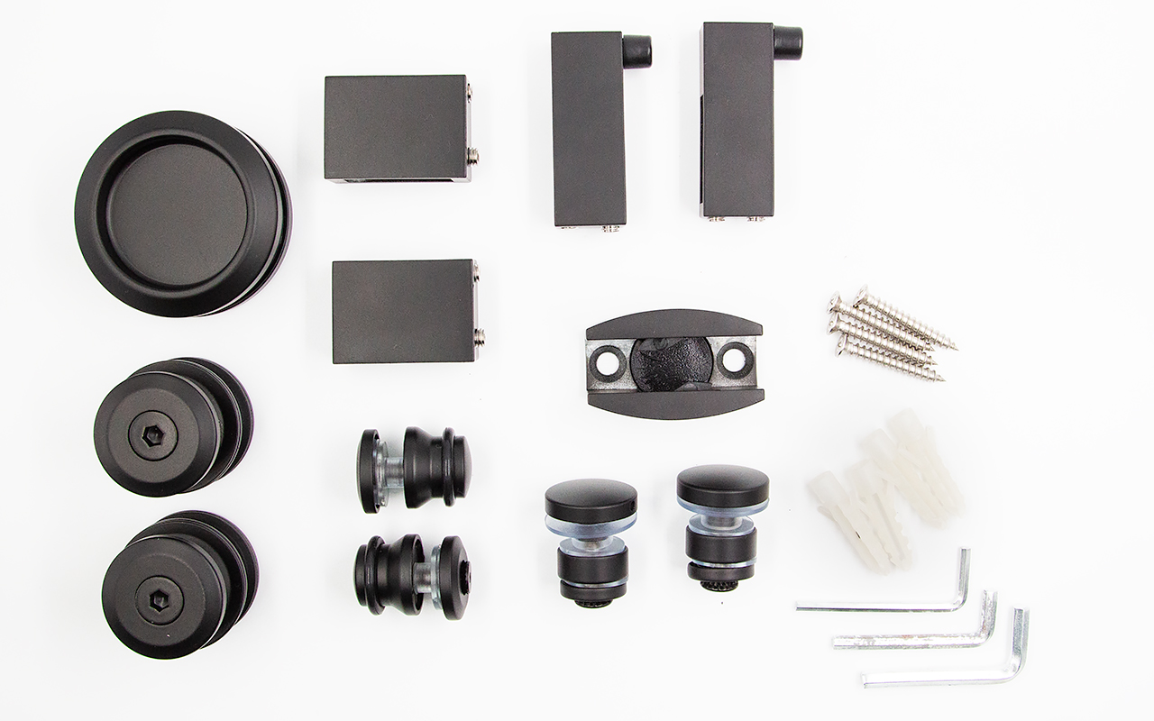 ролик (2 шт.), крепеж стекла к трубе (2 шт.), крепеж направляющая (2 шт.), напольная направляющая (1 шт.), торцевое крепление трубы к стене (2 шт.), стопор (2 шт.), дверная ручка (1 шт.).