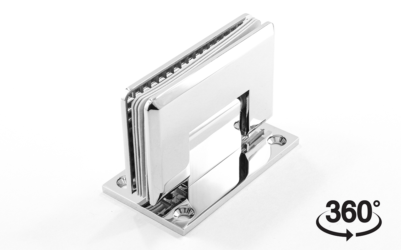 Петля стена-стекло для соединения стеклянной двери душевой кабины со стеной ванной комнаты. Двухстороннее крепление позволяет устойчиво закрепить петлю на стене и уверенно открывать и закрывать дверь в обе стороны.  Максимальный угол разведения стыковочных элементов в плане составляет 90°. Масса двери может составлять 35 кг на две петли.