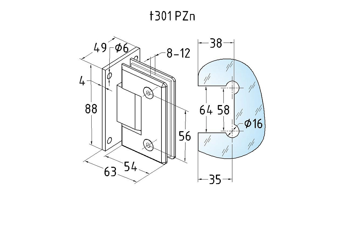 Петля стена-стекло для соединения стеклянной двери душевой кабины со стеной ванной комнаты. Двухстороннее крепление позволяет устойчиво закрепить петлю на стене и уверенно открывать и закрывать дверь в обе стороны.  Максимальный угол разведения стыковочных элементов в плане составляет 90°. Масса двери может составлять 35 кг на две петли.