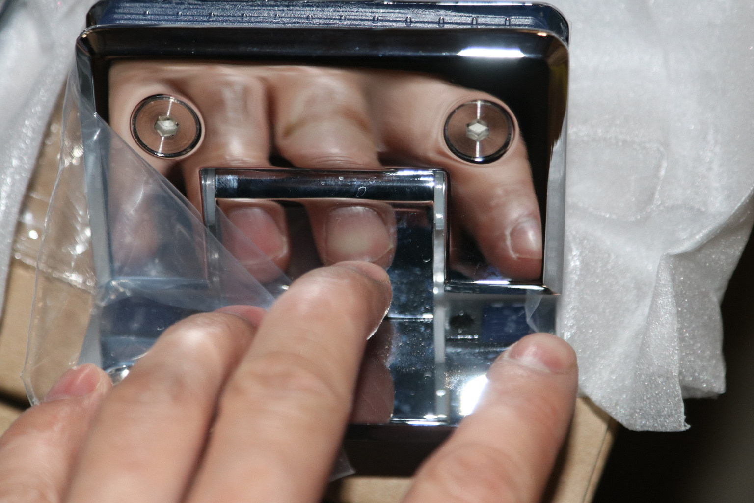 Петля из латуни с полированной поверхностью из хрома предназначена для стыковки между собой конструкционных элементов из стекла, толщина которых находится в диапазоне от 8 до 10 мм. Имеет фланец, со смещением, который при монтаже направляется в сторону душа, в результате чего становится не виден с внешней стороны. Также используется для крепления стеклянной двери к краю стены, продолжая её тем самым визуально. В ней реализована функция самозакрытия и поворота в обе стороны. Петля стекло-стекло крепится с обеих сторон на стеклянные поверхности, плотно прижимаясь к ним своими металлическими зажимами. Максимальный вес двери на 2 петли составляет 45 кг. Имеет функцию доводчика до закрытия от 25°. Максимальный угол разведения стыковочных элементов в плане составляет 90°. Крепление предусмотрено на 5 винтов. Размер одной стороны петли составляет 90х55 мм.