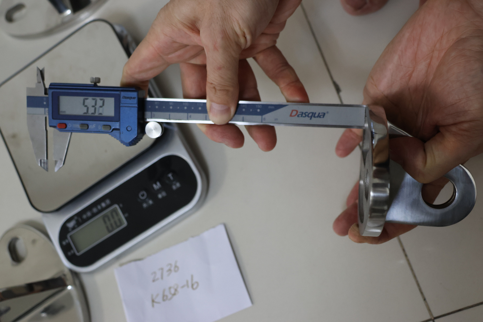 Крепление тяги к стене. Литая, полированная деталь. Состоит из крепёжного элемента с двумя овальными технологическими отверстиями 16,3 на 25 мм для крепления к стене и выносной части с отверстием диаметром 20 мм для крепежа наконечника тяги. Выполнена из стали AISI 316. Ширина детали – 150 мм, расстояние между центрами крепёжных отверстий – 105 мм. Выносная часть выступает на 48 мм от стены.