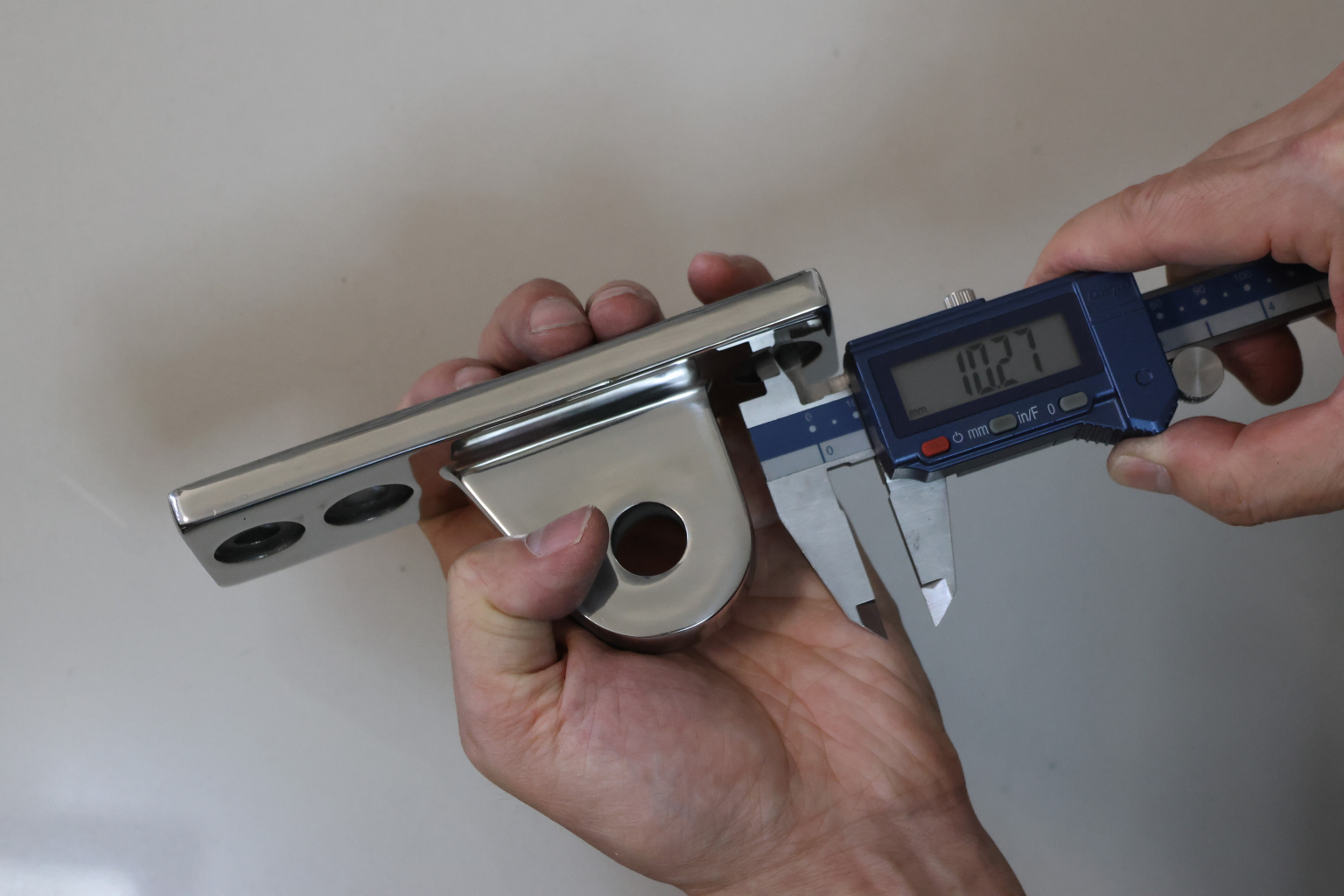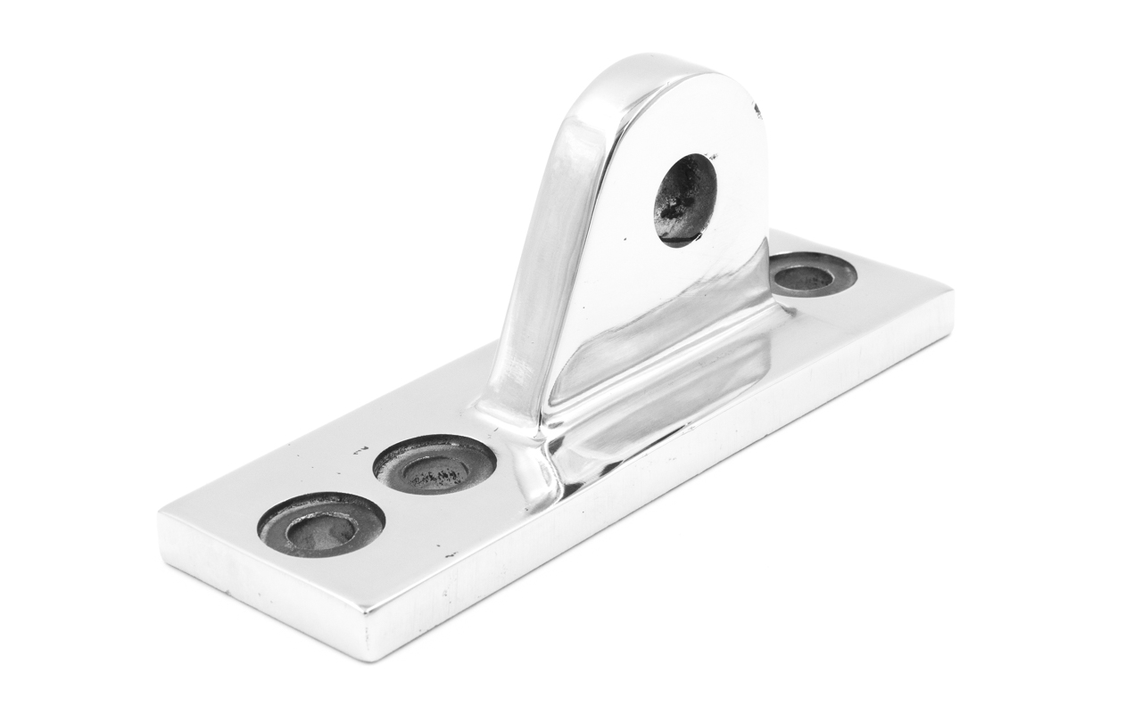 Крепление тяги к стойке. Полированная деталь. Состоит из крепёжного элемента с тремя технологическими отверстиями для крепления к стойке и выносной части с отверстием диаметром 16 мм для крепежа наконечника тяги. Выполнена из стали AISI 304. Ширина детали – 50 мм. Выносная часть выступает на 63 мм от стены.