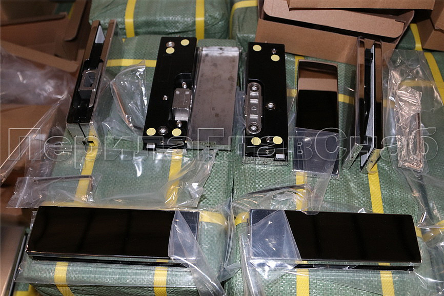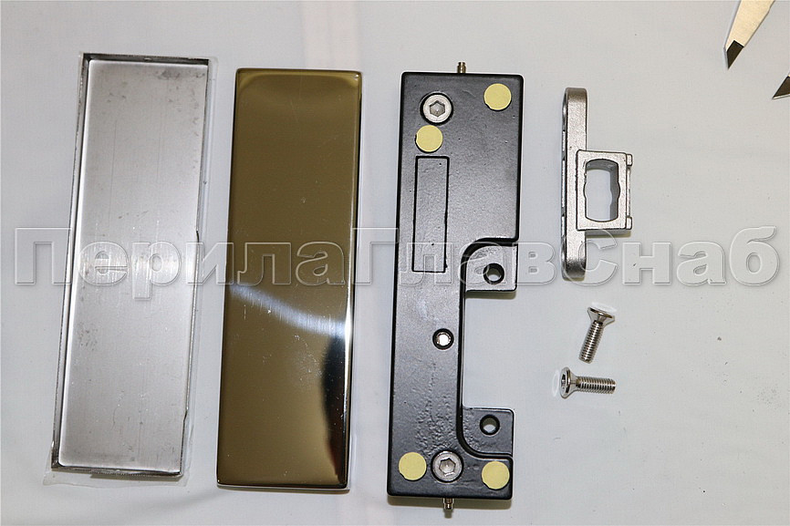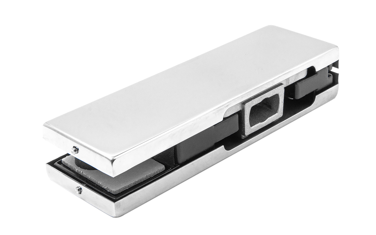 Сбоку нажимаем на крепления крышек и снимаем. Отвинчиваем винты, и фиксируем фитинг в подготовленный вырез в стекле. Далее закручиваем и фиксируем обратно крышки.