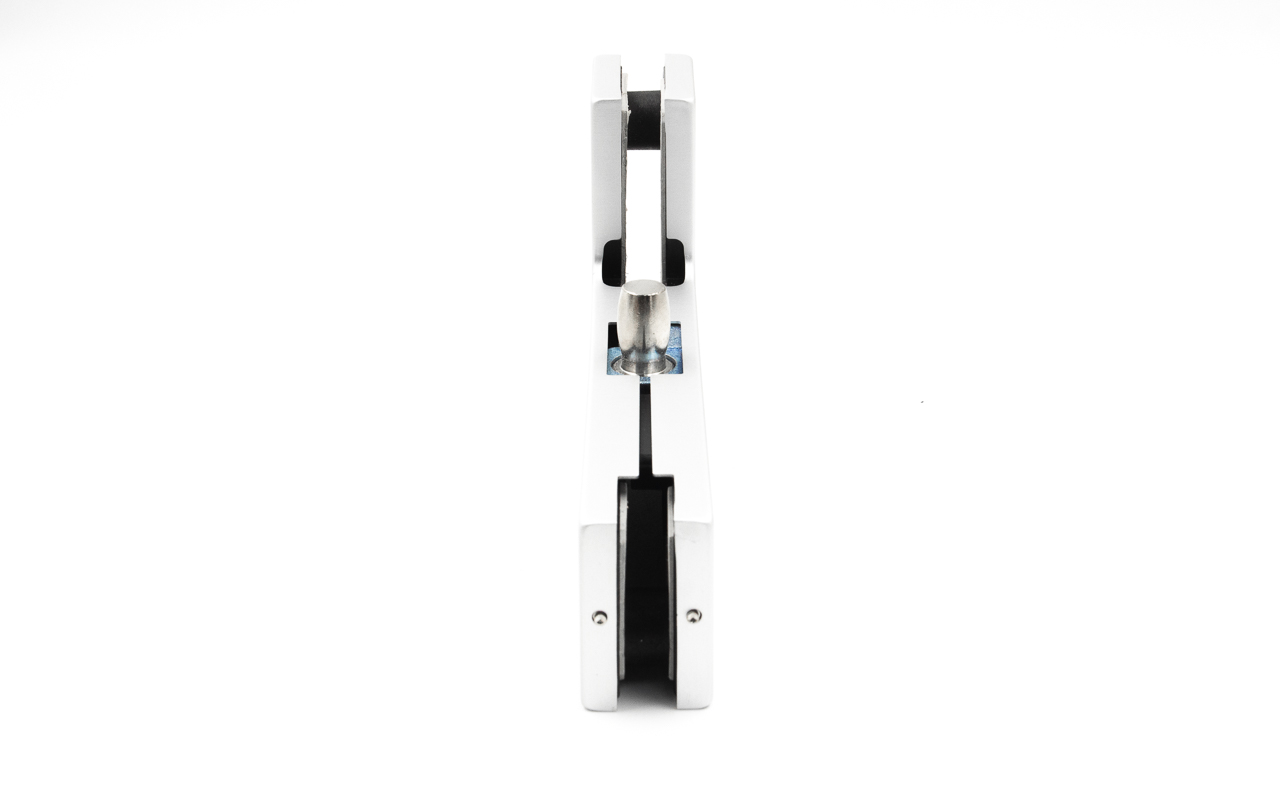 сбоку нажимаем на крепления крышек и снимаем. Отвинчиваем винты, и фиксируем фитинг в подготовленный вырез в стекле. Далее закручиваем и фиксируем обратно крышки.