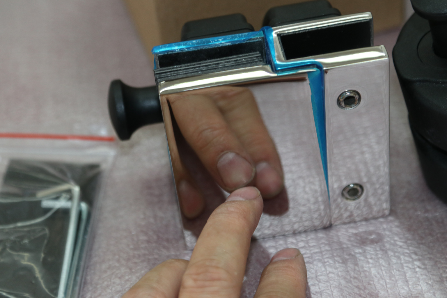 разбираем замок, фиксируем в заранее заготовленное отверстие, замок закручиваем обратно. Аналогично фиксируем ответную часть замка на неподвижное стекло