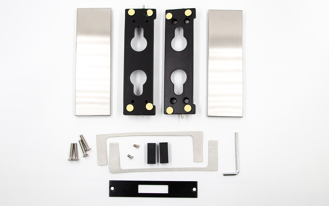 Сбоку нажимаем на крепления крышек и снимаем. Отвинчиваем винты, и фиксируем ответную часть замка в подготовленный вырез в стекле. Далее закручиваем и фиксируем обратно крышки.