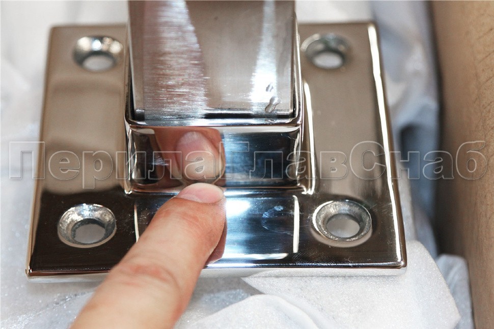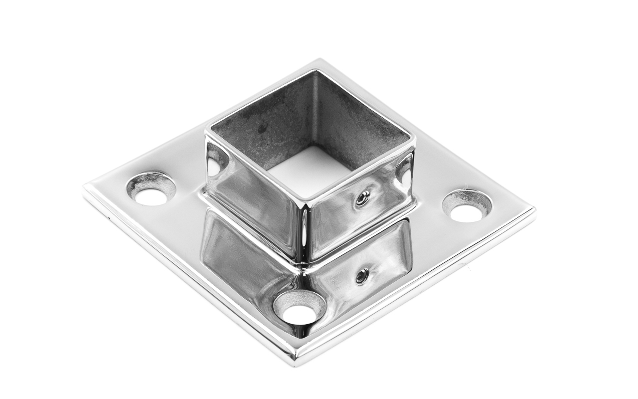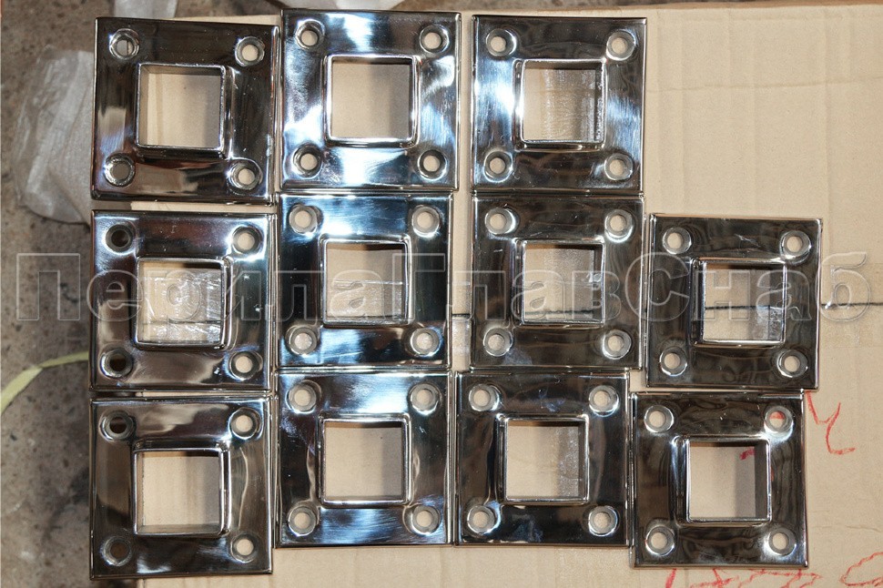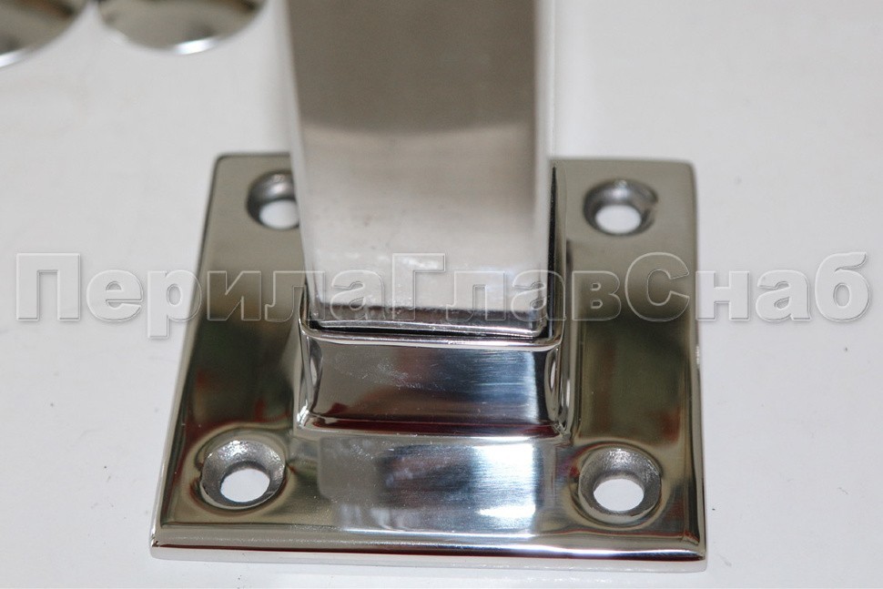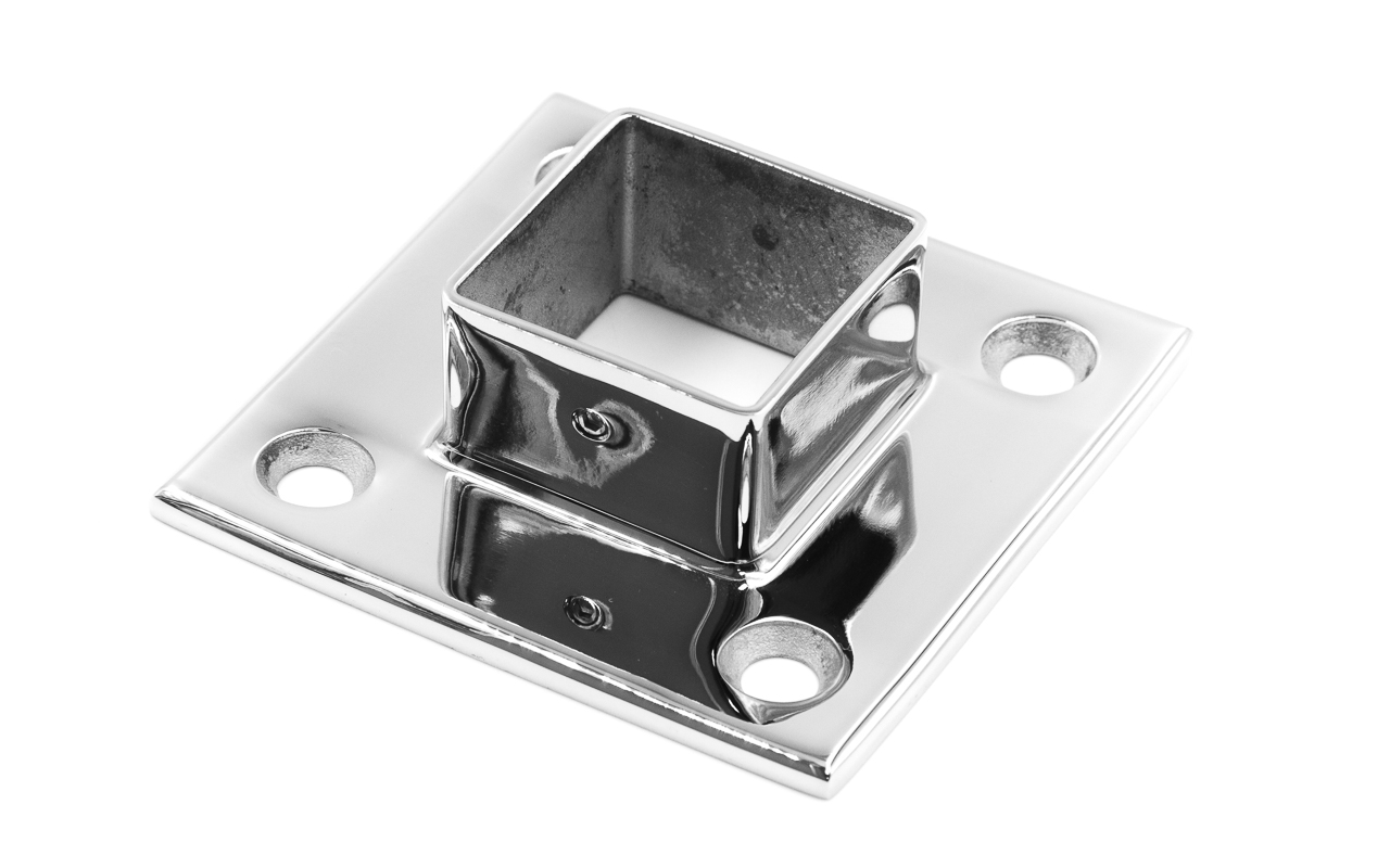 Фланец для трубы 40х40 мм. С четырьмя отверстиями под саморез с потайной головкой 8.6 мм. Деталь литая, полированная. Способ крепления: самосбор и сварка. Марка стали - AISI 304.