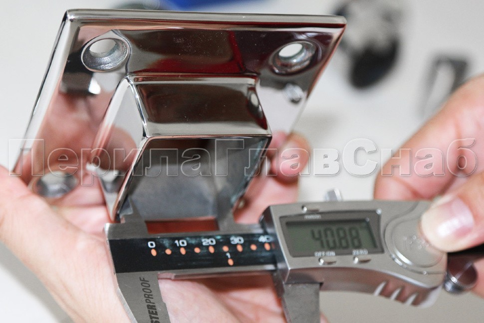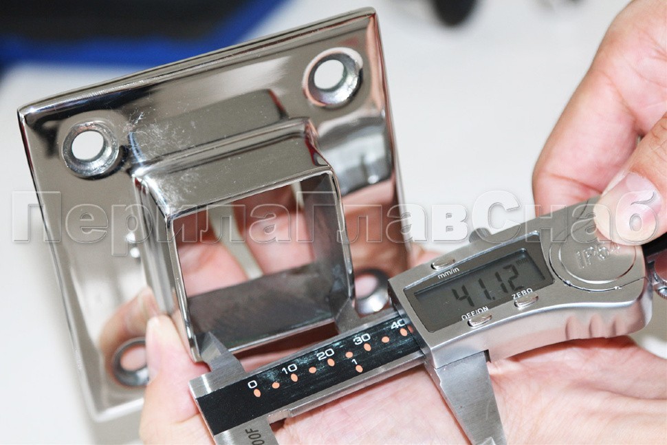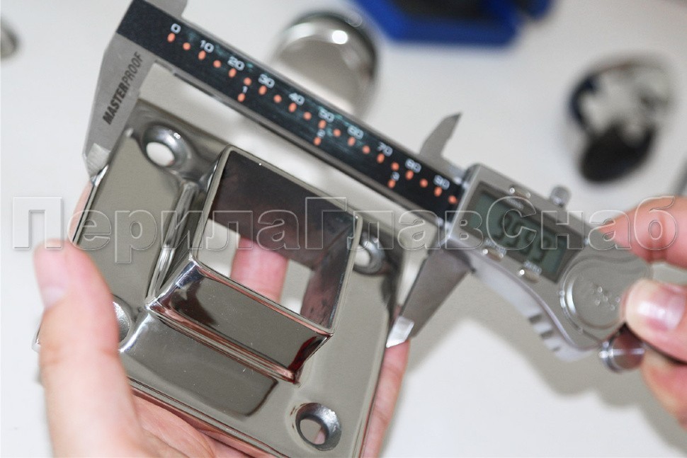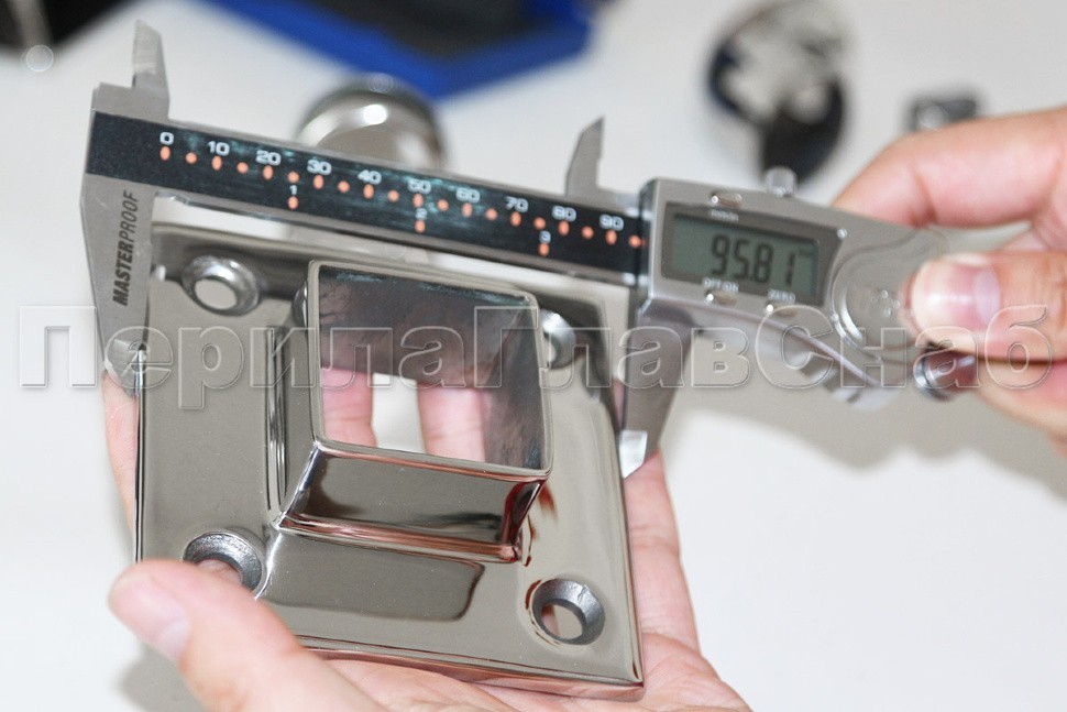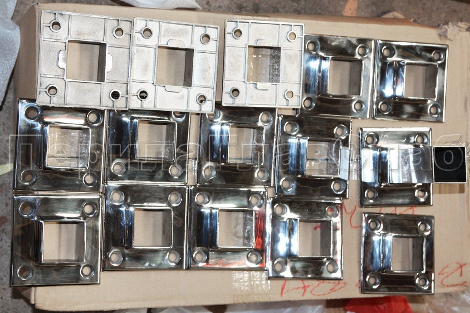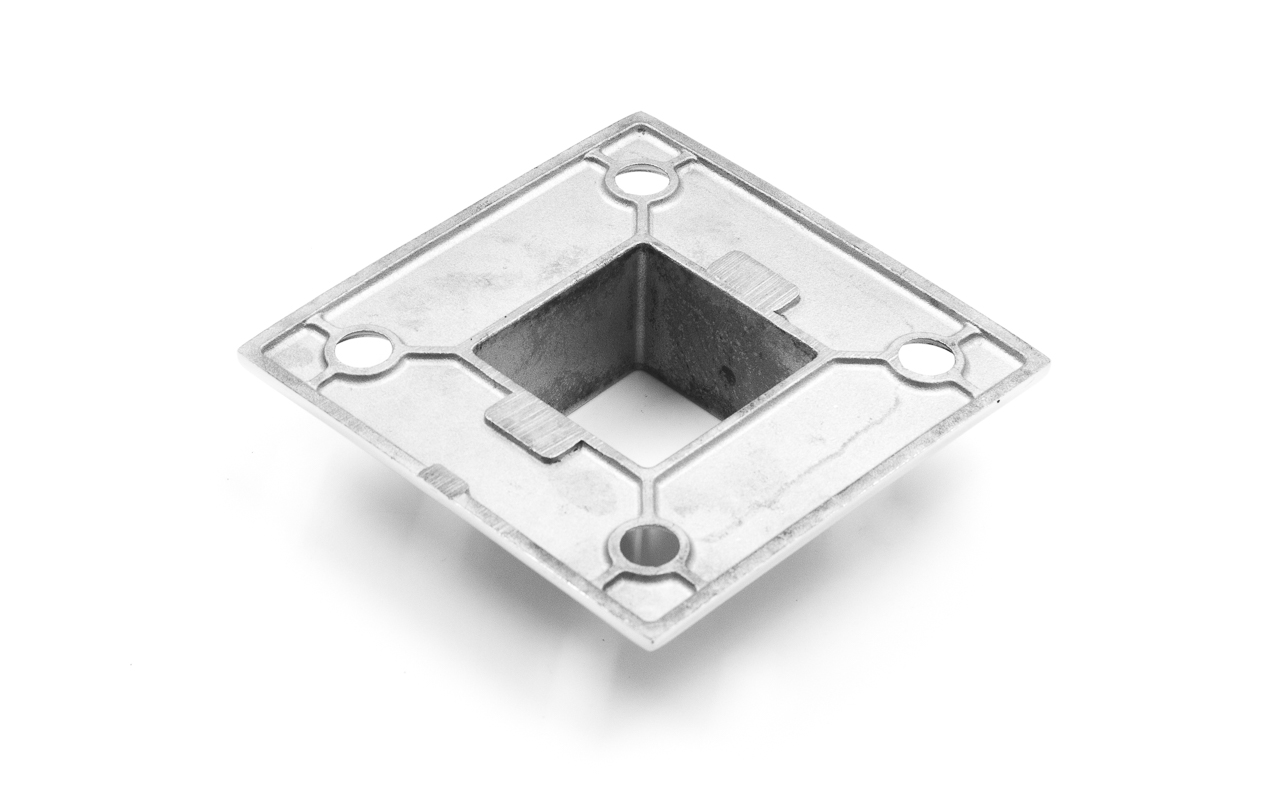 Фланец для трубы 40х40 мм. С четырьмя отверстиями под саморез с потайной головкой 8.6 мм. Деталь литая, полированная. Способ крепления: самосбор и сварка. Марка стали - AISI 304.