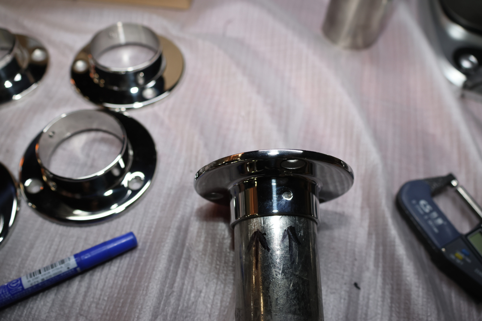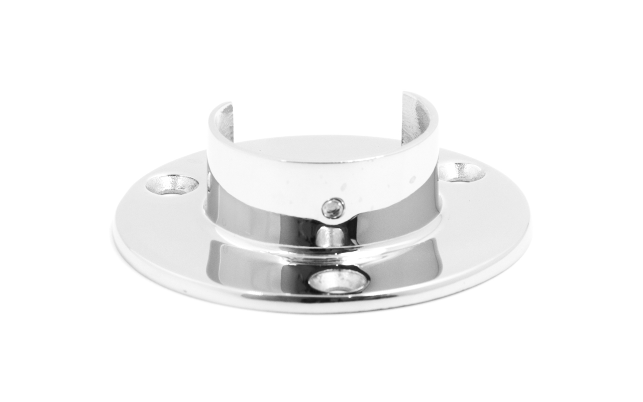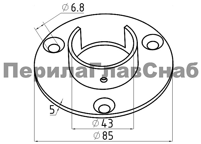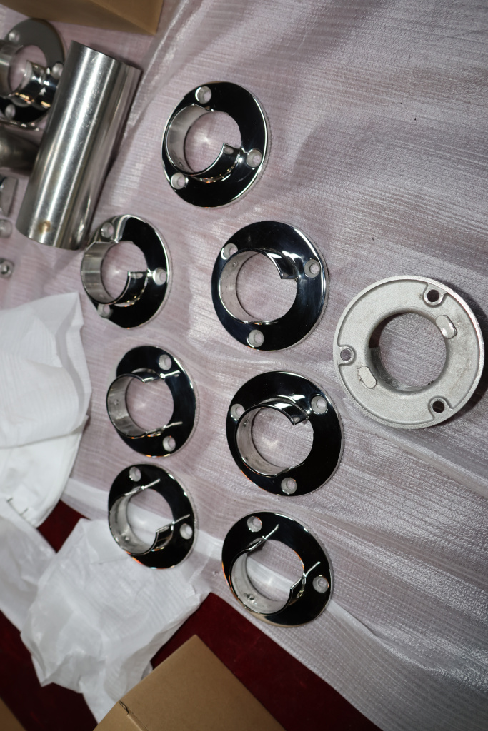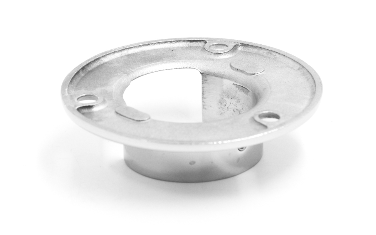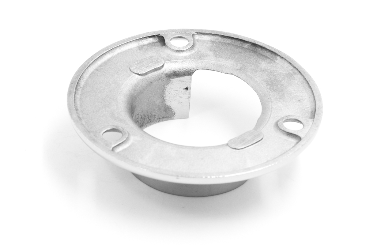 Фланец для трубы диаметром 42.4 мм. С тремя отверстиями под саморез с потайной головкой 6.8 мм. Деталь литая, полированная. Марка стали - AISI 304.