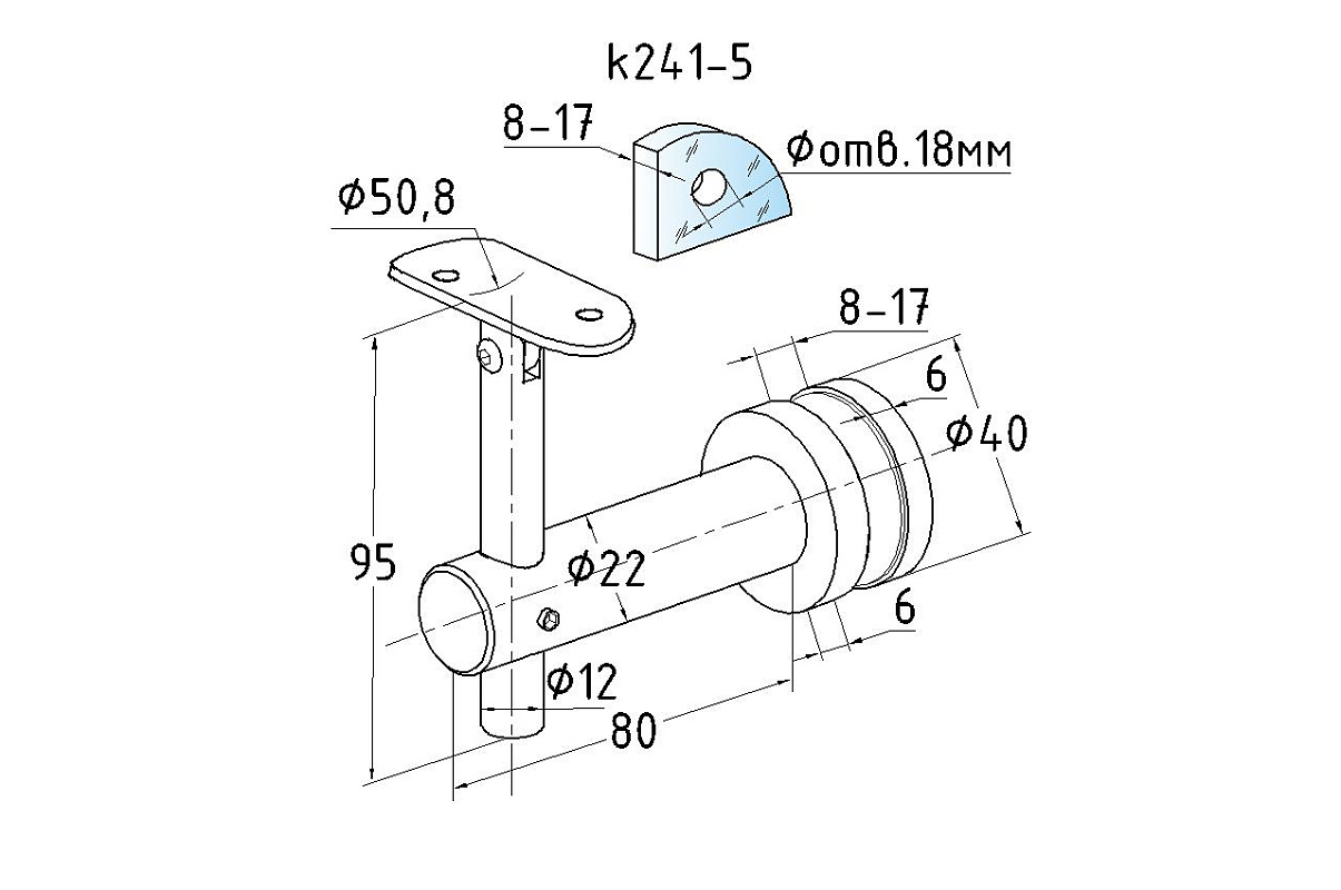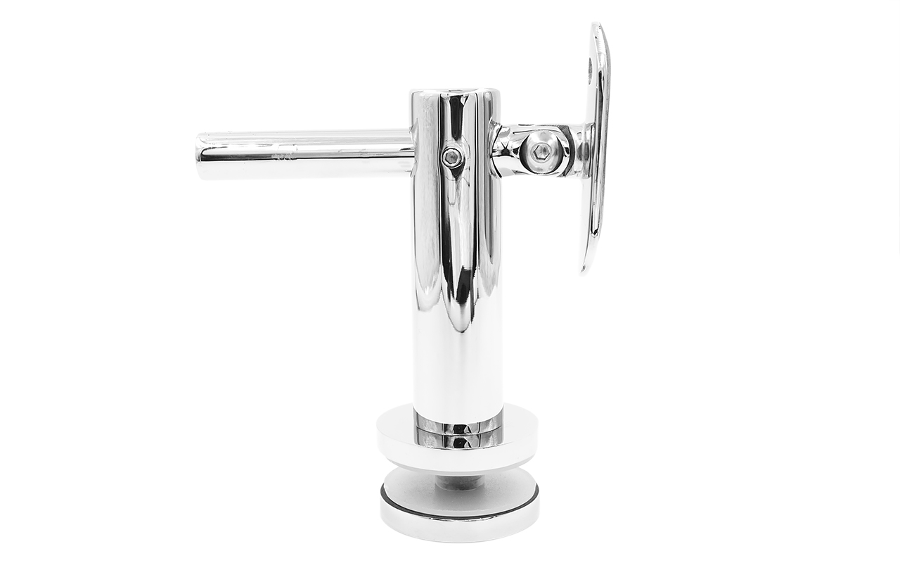 k241-5 выносной держатель поручня на стекло 8-20 мм, регулируемый, с ложементом, полированный, (AISI 304) под отверстие в стекле Ø17-18 мм