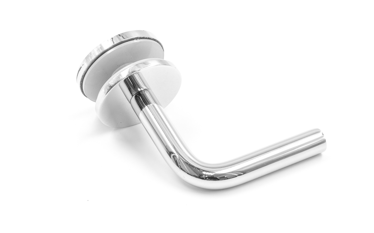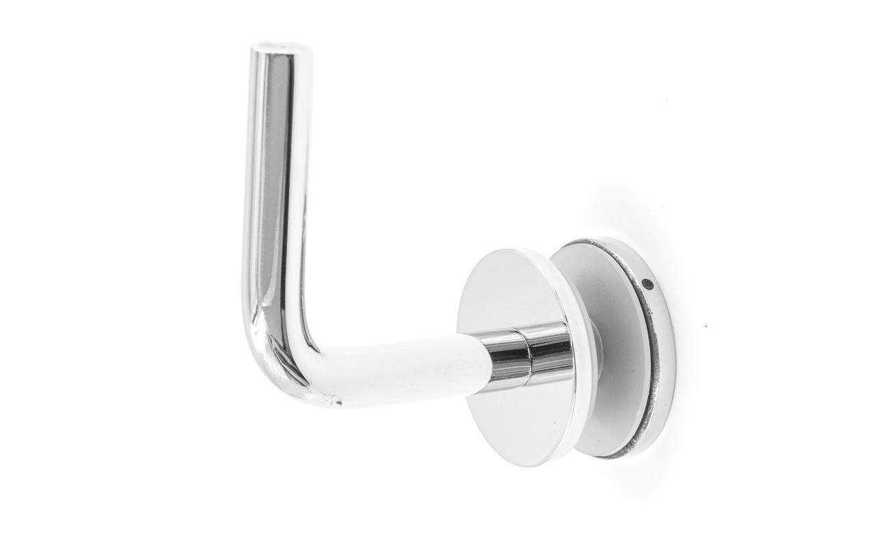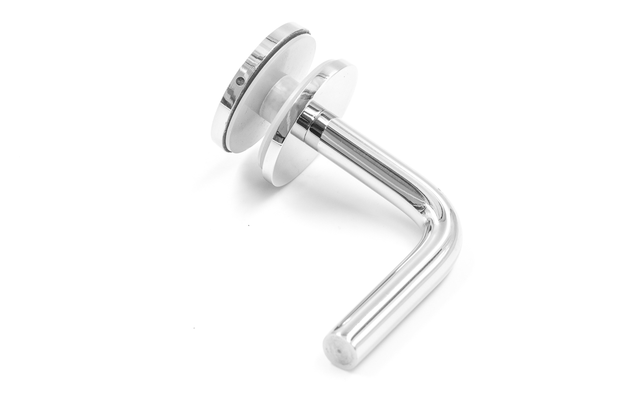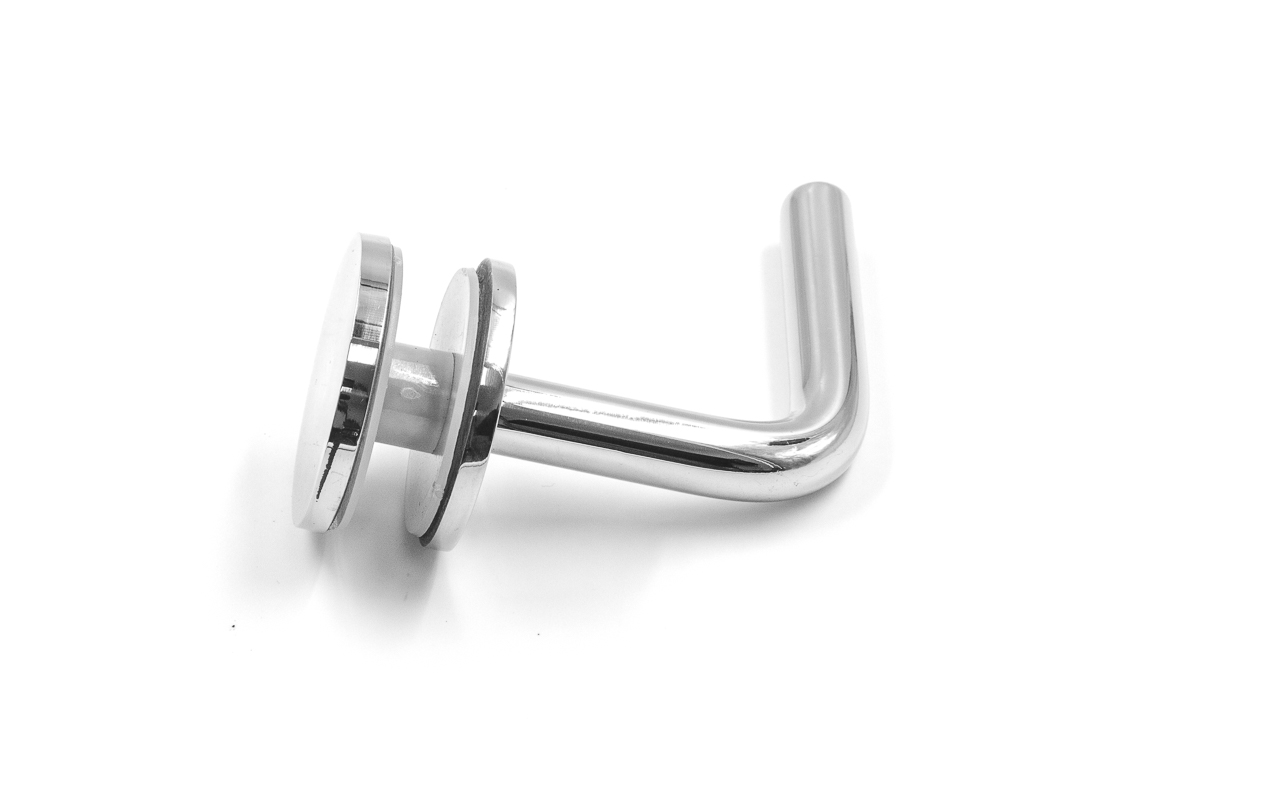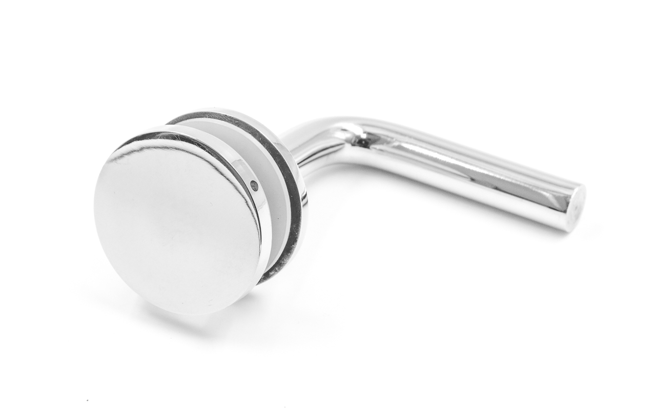 Для установки бокового держателя в стекле сверлится отверстие Ø17 мм, затем пристенок фиксируется затяжной гайкой в торце фланца. А сам поручень приваривается к загнутому наконечнику фитинга.