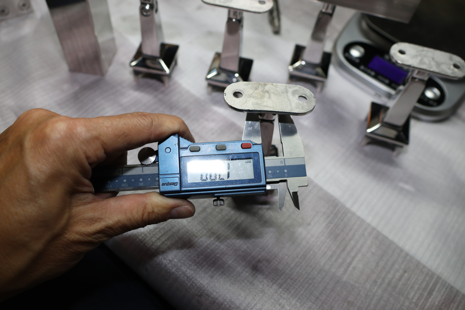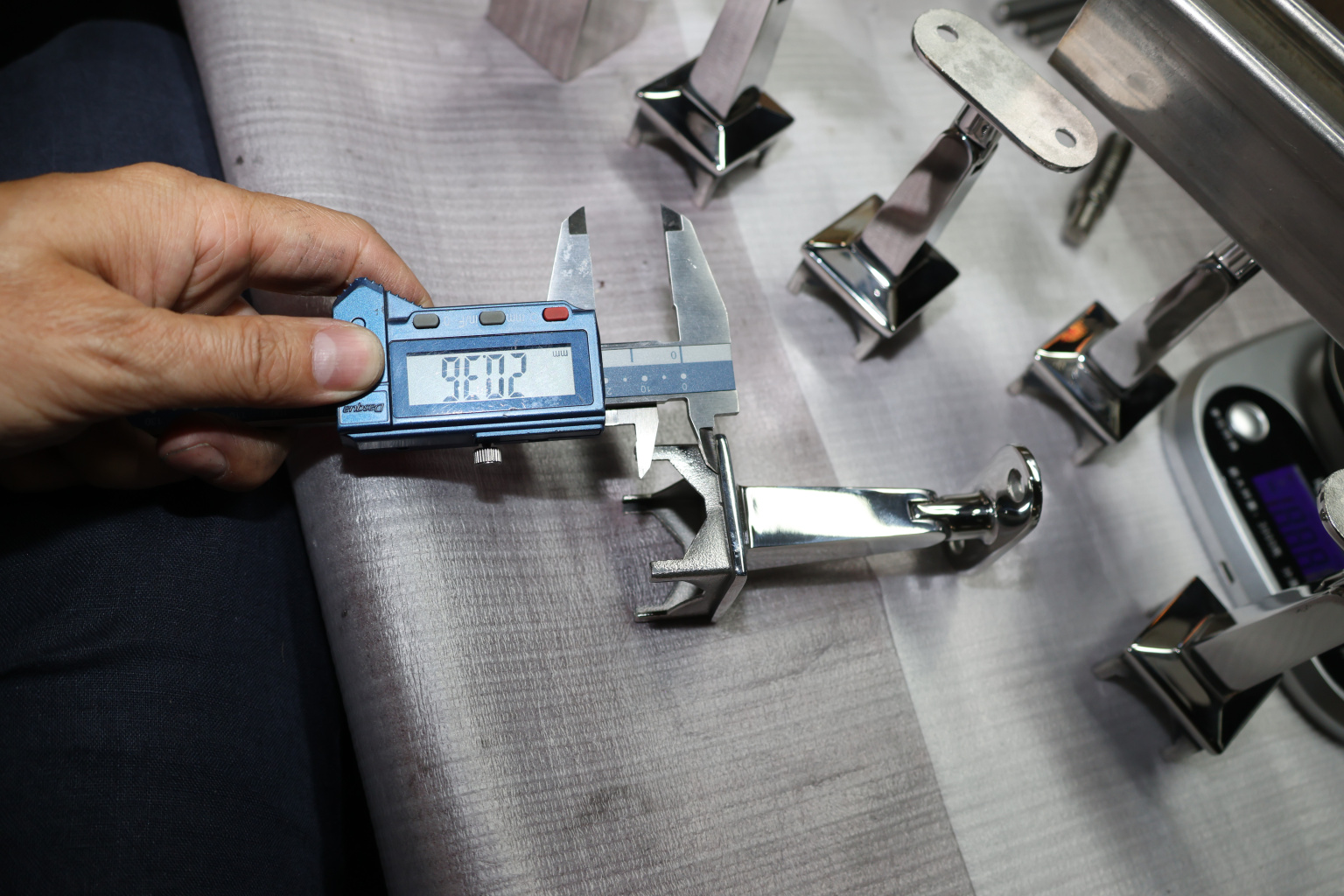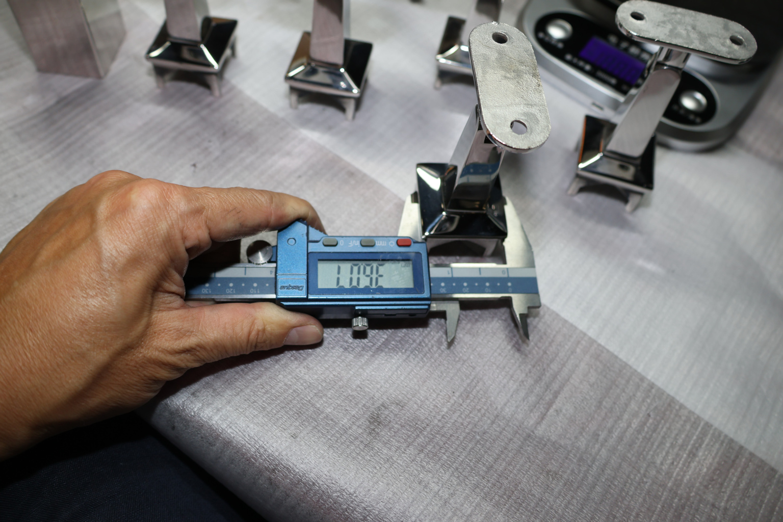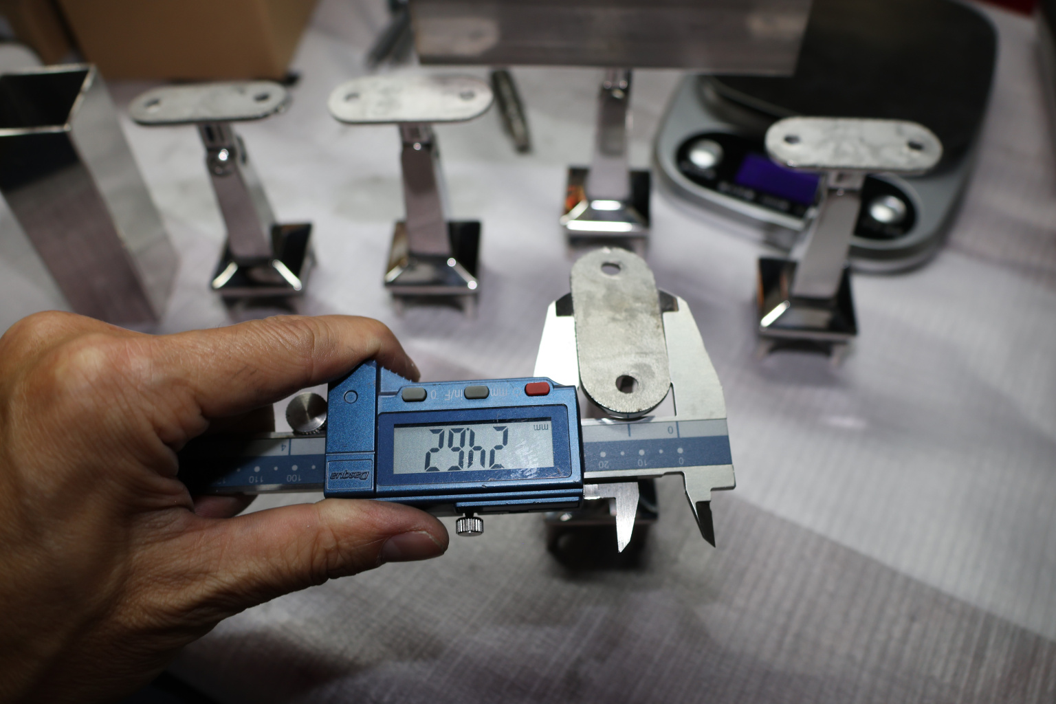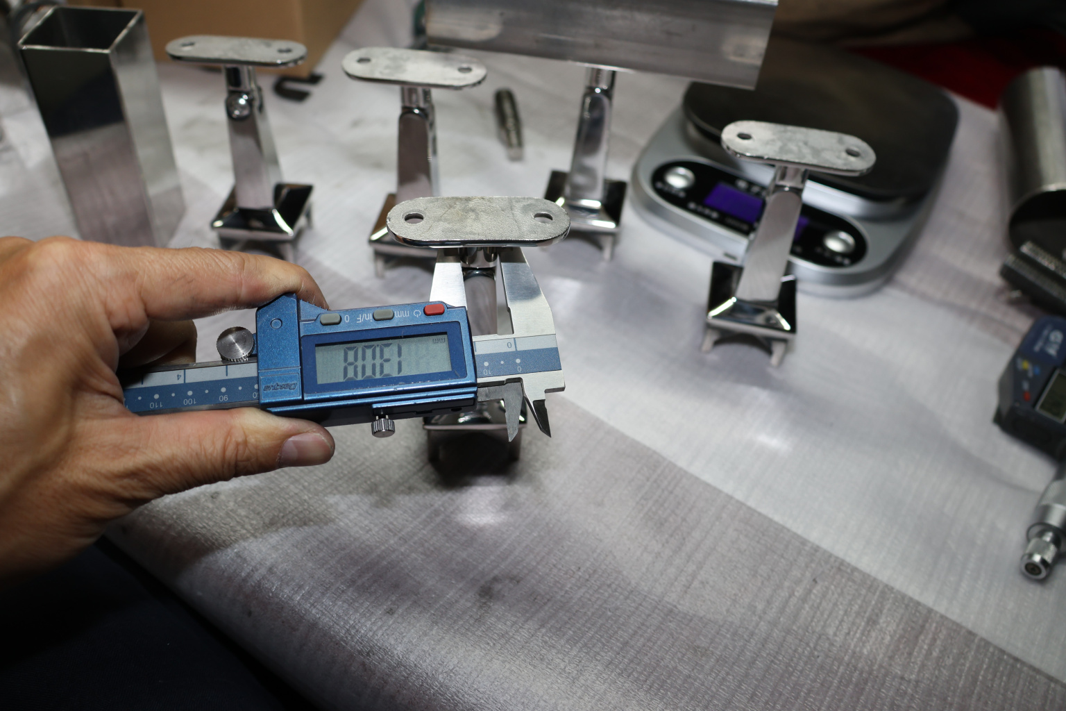 Наконечник на стойку из профильной трубы диаметром 40х40 мм, с регулируемым ложементом под плоскость. Наконечник литой, полированный, нержавеющий. Марка стали - AISI 304