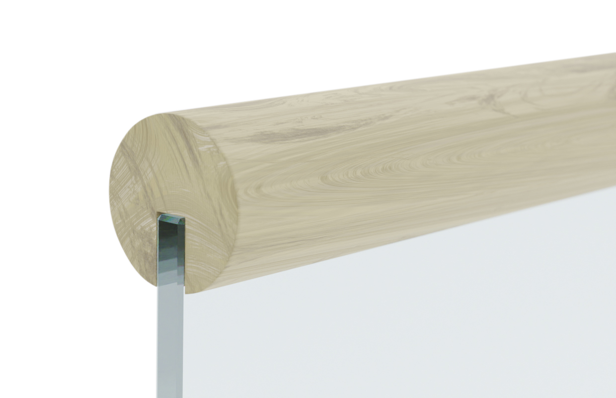 Паз под стекло, как правило, делают на 1мм шире, чем толщина стекла. Глубина варьируется от 20 до 22 мм, при добавлении светодиодной подсветки в паз - до 27мм. Для монтажа используют силикон, например Ф-1129. В местах поворотов и переходов стоит запиливать поручень под нужным углом и соединять с помощью шпильки (М-3967 или М-3969) вместе с каучуковым клеем Titebond (Ф-1106). По торцам рекомендуется использовать деревянные заглушки (Ф-0842, Ф-0842-2).
