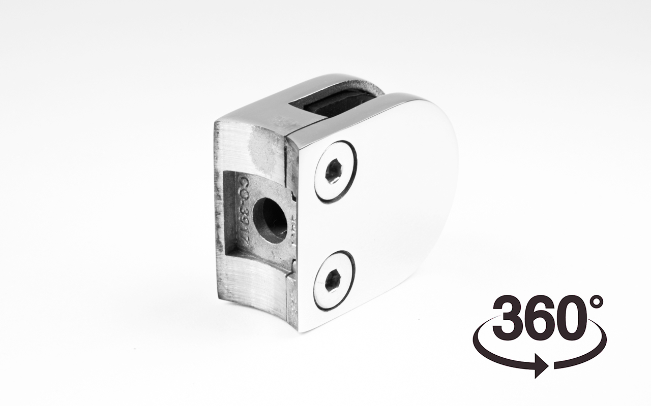 Стеклодержатель литой с вставками под стекло 8-10 мм, 4+4 мм, закругленный под стойку Ø38.1 мм (40х22х50), полированный. Марка стали - AISI 304.