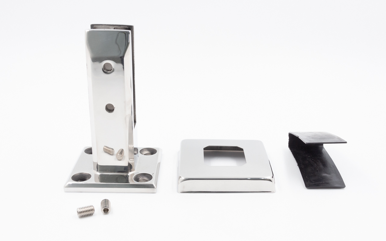 Стеклодержатель литой напольный, 50х50х160 мм, для стекла 16 мм, полированный, 600 Grit, без сверления. Марка стали - AISI 304. Так же вам понадобиться для крепежа потайной винт под шестигранник k601-19-120