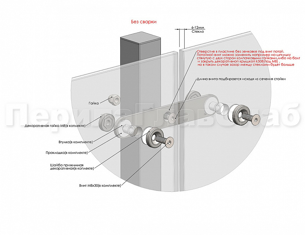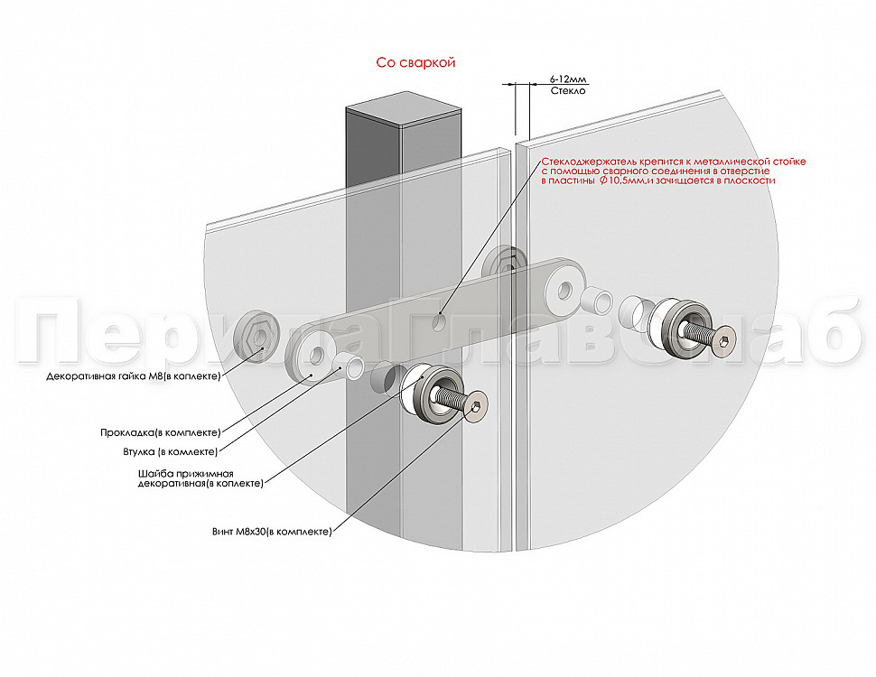 Детали стеклодержателя изготовлены из нержавеющей стали пригодной для использования на уличных ограждениях со стеклом.