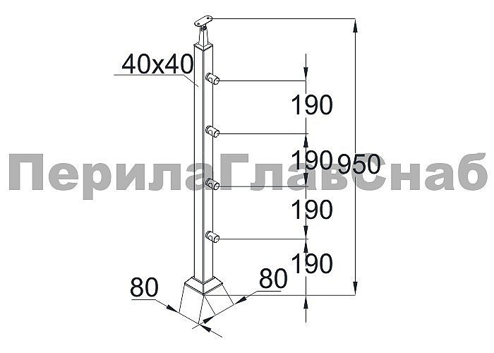 Cтойка квадратная 40х40: 4 ригеледержателя, полированная, высота 950 мм (aisi 304)