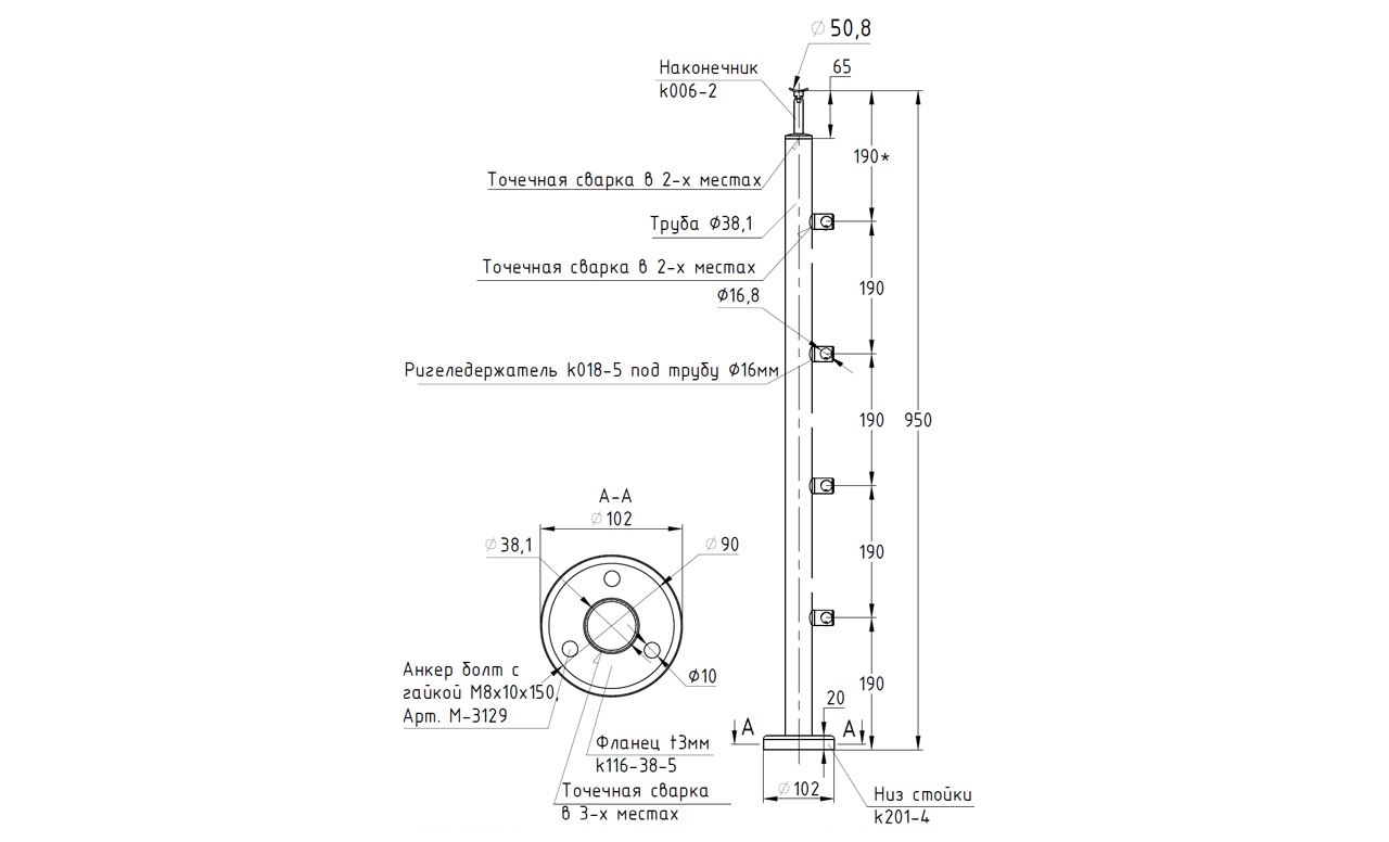 Готовые стойки – это экономия вашего времени и денег. Приобретая готовую стойку Вы можете собрать ограждение сами, не привлекая монтажную бригаду и экономя денежные средства на монтаже. Стойка легко монтируется к полу благодаря треханкернуму фланцу с отверстиями под анкер-болт М8 ( М-3129, М-3843, М-3838), а крепеж скрывает декоративная крышка идущая в комплекте стойки. Ригеля фиксируются при помощи шестигранника ( k931, k932). Поручень из нержавеющей стали так же легко закрепить при помощи сверла по нержавеющей стали ( k961-03, k961-03.5, k961р-03.5, k961р-03) и самореза ( М-3850, М-3847, М-3215). Либо при помощи заклепки ( М-3214) и винта М6 ( М-3973), для крепления при помощи заклепок необходимо растачивать отверстие в ложементе. Если вы используете пластиковый ( k893, k897, k892, k891, k894, k895, k899) или деревянный поручень, то его можно закрепить при помощи саморезов ( М-3217).