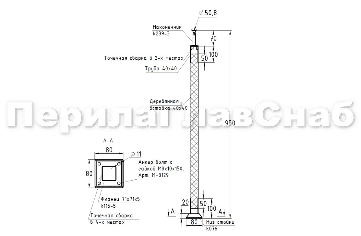 Стойка квадратная 40х40: полированная базовая, с плоским наконечником, высота 950 мм k743-9