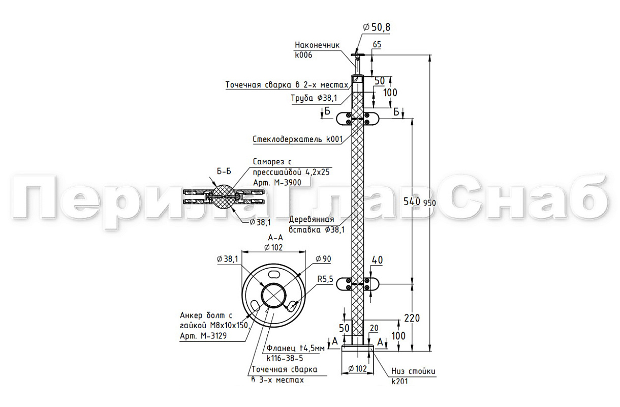 Готовая стойка Ø38,1 мм, с фланцем и наконечником, высота 950 мм, полированная (AISI 304) k702 купить в Воронеже