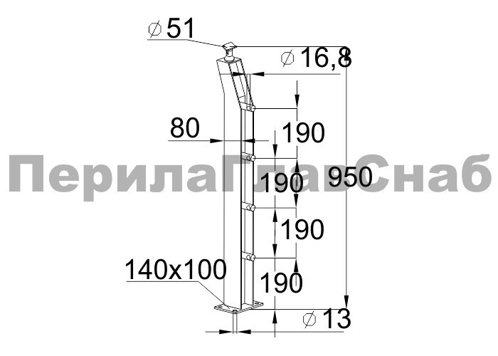 Стойка квадратная 40х40: 4 литых стеклодержателя, полированная, высота 950 мм (AISI 304) k746 купить в Воронеже
