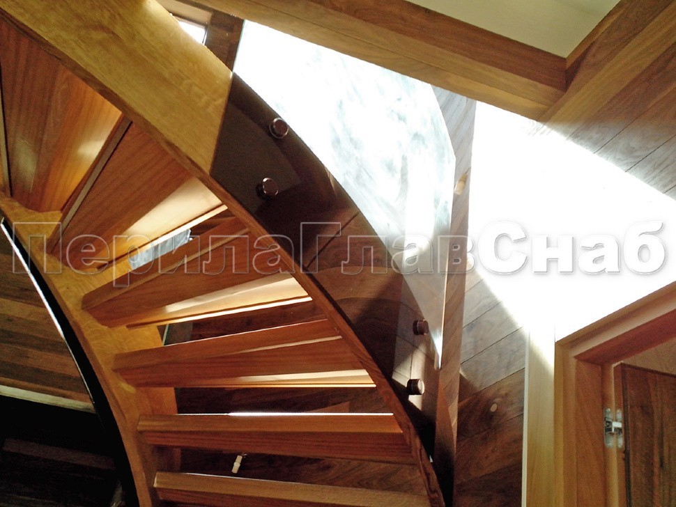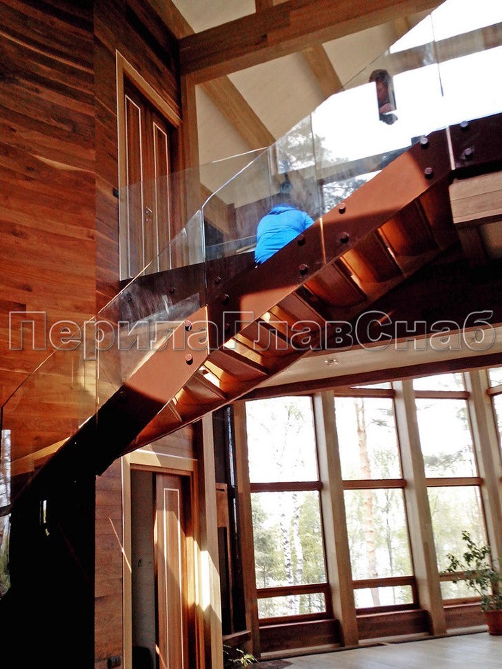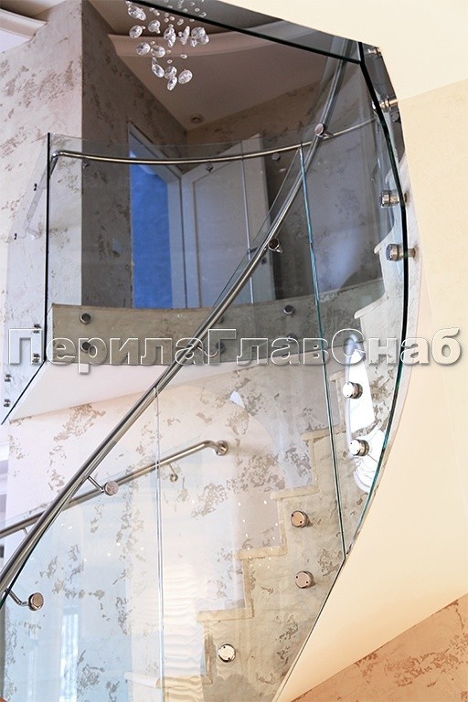 Ограждение забежной лестницы с моллированным стеклом. Нержавеющий полированный поручень повторяет контур стекла.