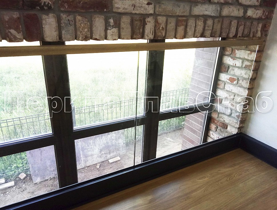 Цельностеклянное, стекло каленое 12 мм, на точечном креплении с декоративной накладкой из стального листа с покраской. Поручень из массива дуба 60х40мм., с пазом на стекло и с подсветкой светодиодной лентой.