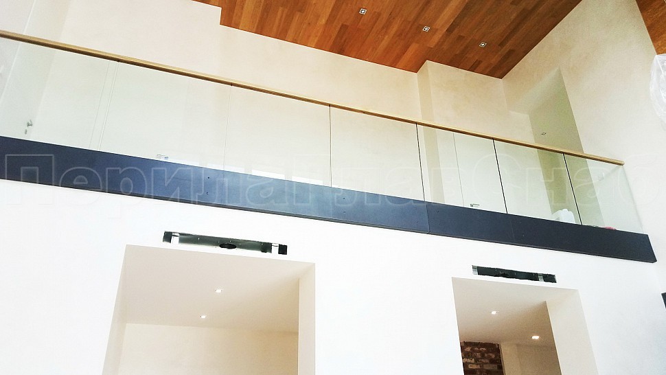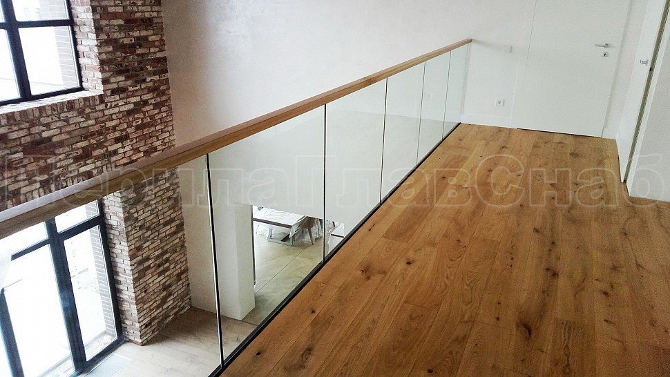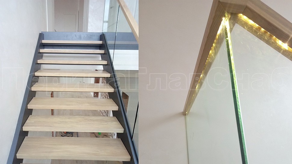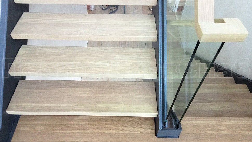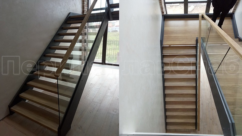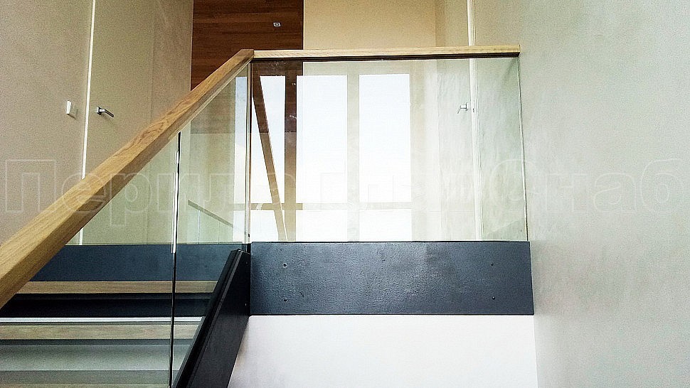 Нашей бригадой была установлена лестница на двух тетивах, выполненных из листа толщиной 10 мм из черного металла с покраской по RAL, с деревянными ступенями толщиной 50 мм из дуба- окрашены согласно каталогу морилок. Ограждения лестницы внутренние и второго света выполнены из закалённого прозрачного стекла толщиной 12мм, на стекла через паз крепится деревянный поручень габаритами 50x40мм- так же как ступени, окрашен согласно каталогу морилок. Само стекло крепится с торца при помощи точечного держателя из нержавеющей стали. Также были установлены подобные ограждения с поручнем на атриум в доме.