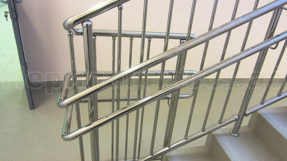 - У лестницы же стойки имеют высоту чуть большую — 950 мм, труба Ø38 мм. Устанавливаются на расстояние через две ступени в третью, на прямых участках не более 1000 мм друг от друга. Наконечник выполнен в декоративном стиле в виде сферы. Для большей безопасности установлены семь ригелей между стойками, и, в отличие от пандуса, они крепятся к стойке сваркой снизу и установлены вертикально. Поручень двойной диаметром 38 мм установлен на высоте 700 мм и 900 мм, крепится к стойке на выносных держателях и на поворотах завязан бубликом.