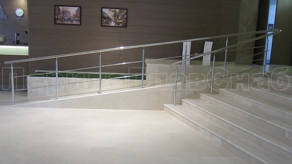 • Ограждение пандуса исполненно из нержавейки с двумя ригелями. Поручни из круглой трубы на нем завязаны в повороте для непрерывности скольжения руки.