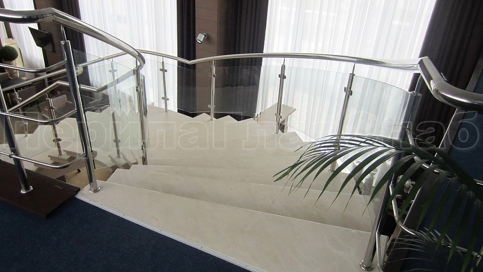 • Цельностеклянные ограждения на лестницу с зажимными стеклодержателями и стойками. Всего было установлено восемь погонных метров ограждения. Поручни и стойки выполнены из нержавеющей стали, а осветленные стекла придают конструкции визуальную легкость и современного изыска в исполнении.