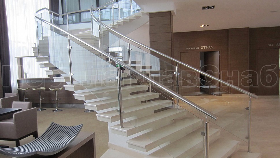 • Далее поручни цельностеклянных ограждений без разрыва переходят в ограждение из нержавеющей стали с тремя ригелями в атриуме.