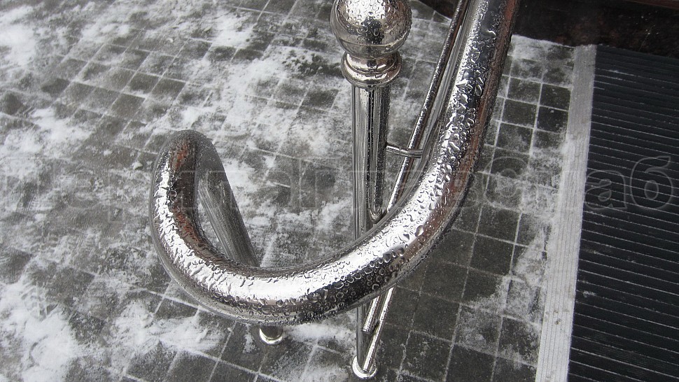 По общему согласованию с клиентом были установлены ограждения со стойками и тремя ригелями. Сверху к стойкам крепится уходящий в пол поручень диаметром 50 мм. Также на стойках крепятся декоративные наконечники в форме шара, что придает конструкции, и так гармонично вписывающейся в общий стиль отеля, особого шарма. Вся конструкция выполнена из качественной полированной стали марки AISI 304.