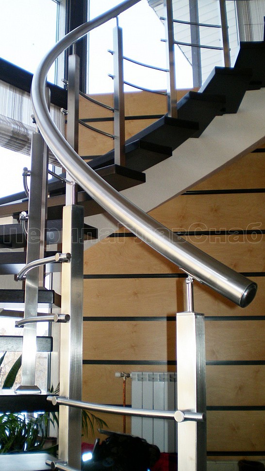 Верх стойки штырь, низ стойки фланец с крышкой. Окончание поручня заглушка, уход поручня в стену через фланец. Поручень у данной конструкции завязан, а ригель выполняет не только защитную функцию, но и декоративную