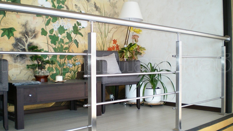В загородный дом было установлено стильное ограждение из шлифованной нержавеющей стали высотой 950 мм с двумя ригелями диаметром 16 мм и поручнем 50 мм, стойками 40Х40 мм, которые устанавливаются через ступень на вторую.