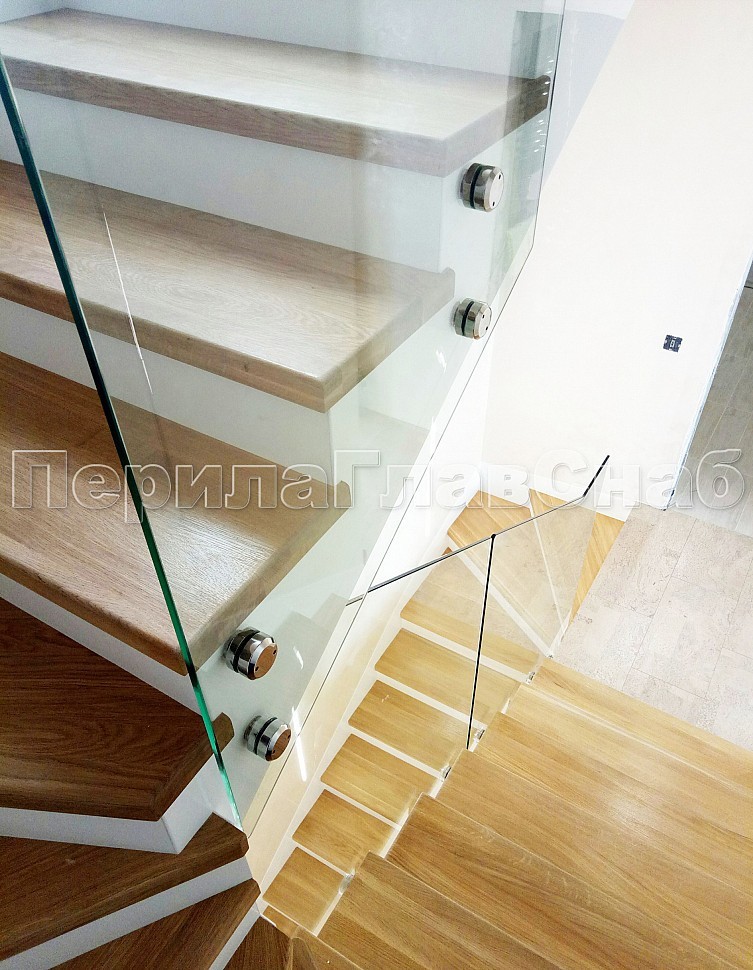 Стекло прозрачное, каленое 10 мм, крепится к торцу лестничного марша на точечном креплении из нержавеющей стали.