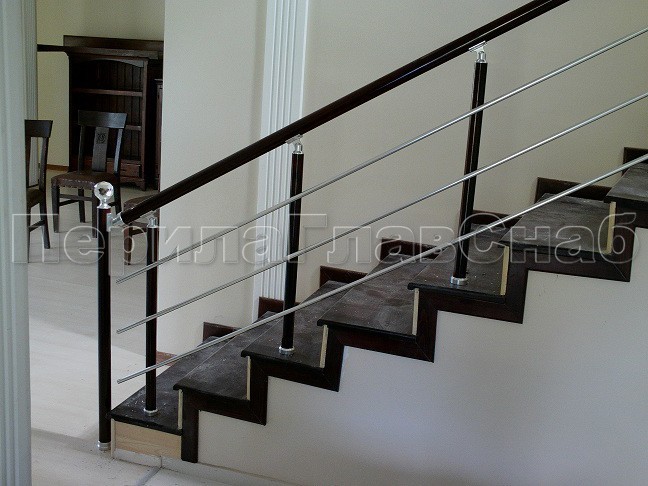 Нержавеющие ограждения без ригелей с круглым деревянным поручнем и стойками с деревянными вставками