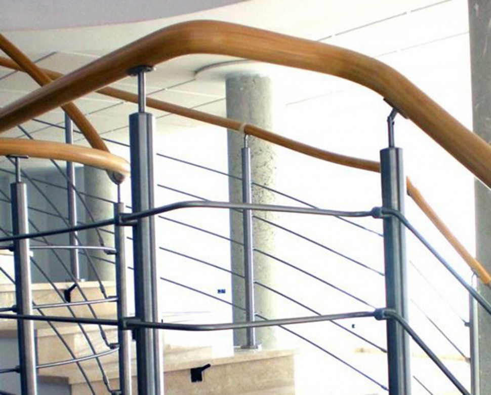 Нержавеющие ограждения без ригелей с круглым деревянным поручнем и стойками с деревянными вставками