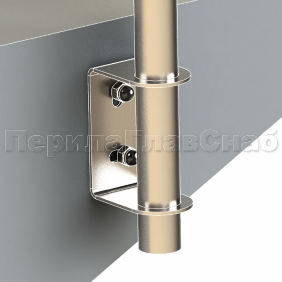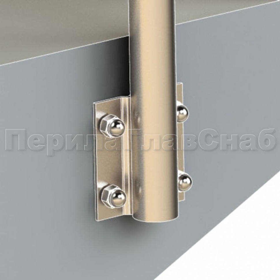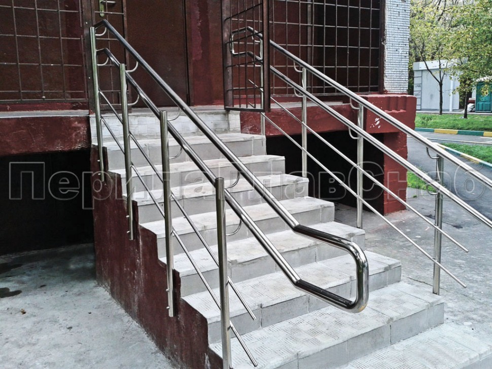 сдвоенный, из круглой нержавеющей трубы диаметром 38,1 мм. Нижний и верхний поручни завязаны при помощи отводов. Поручень может крепиться на выносные держатели.