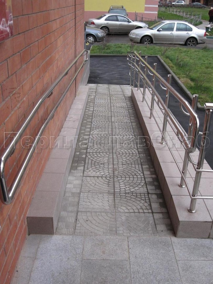 Окончание поручней пандуса скругленное. Поручни связаны между собой.