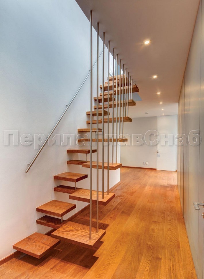 Ограждения с двумя стойками в каждую ступень с деревянным поручнем и без ригелей
