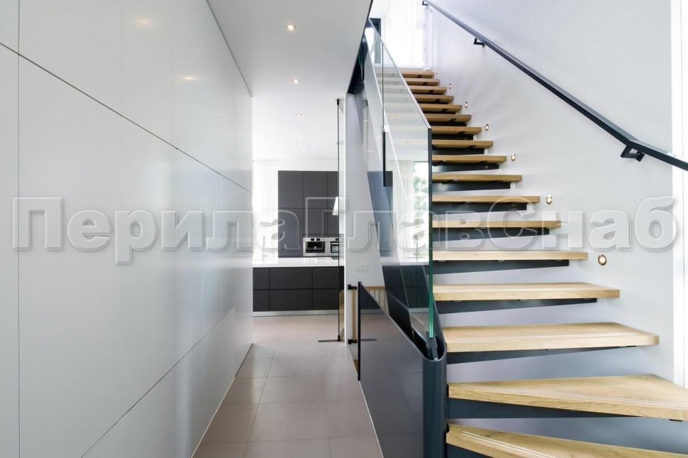 Ограждение лестницы со стеклом, тонированным в массе, стойки и завязки поручня из латуни