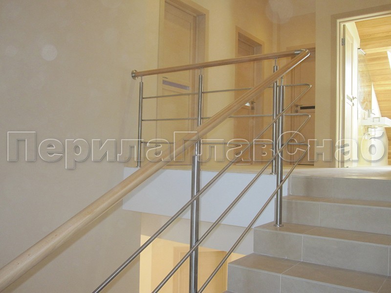 Три ригеля на сварке, квадратный деревянный поручень и круглые стойки