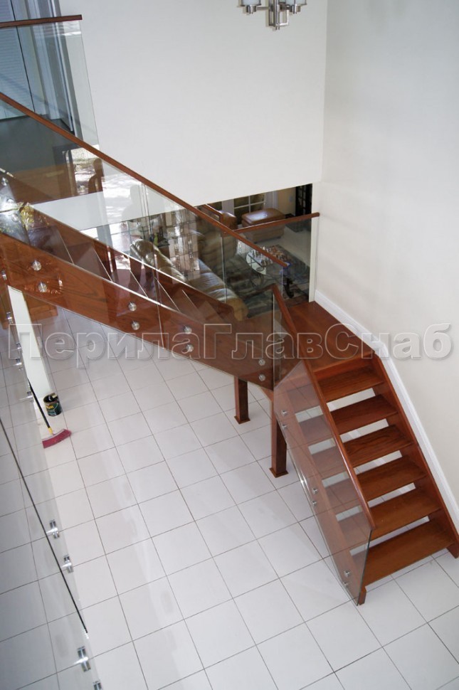 Ограждение с деревянным поручнем на выносе на точечном креплении на лестнице