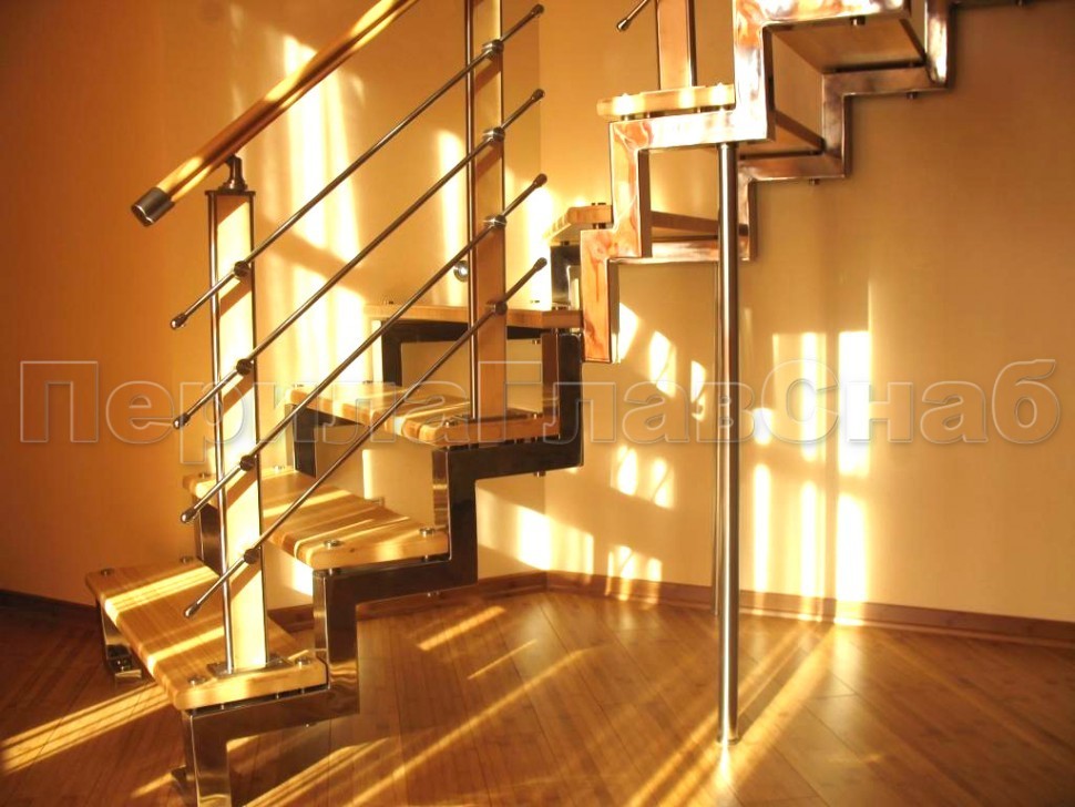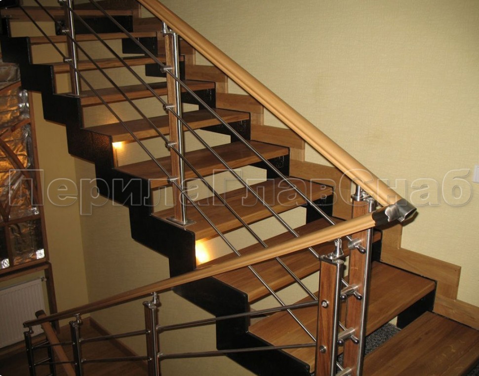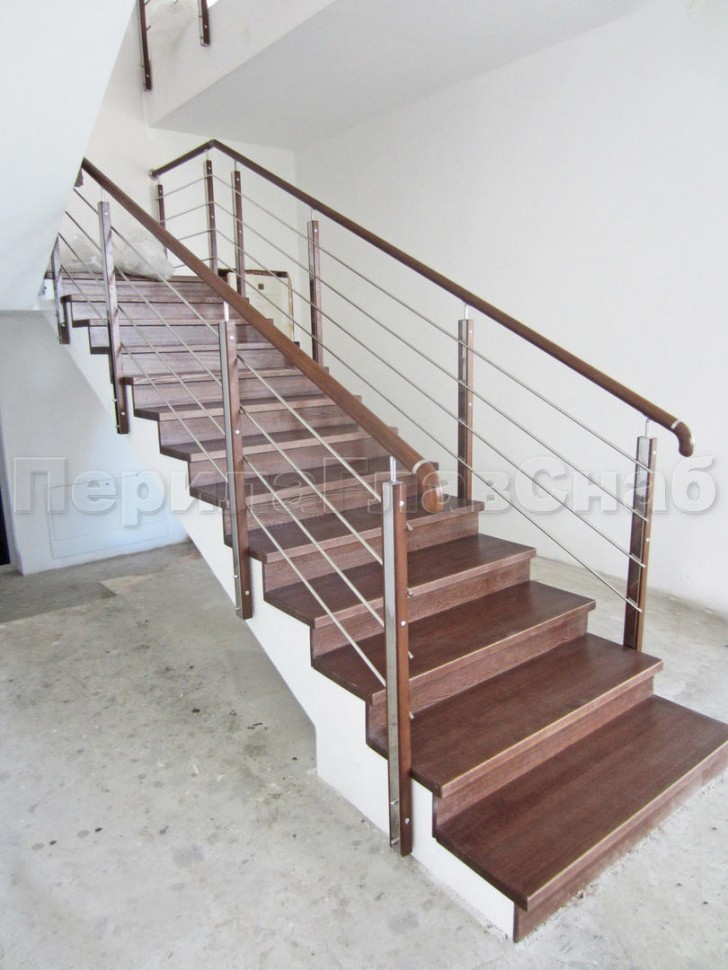 Ограждения с двумя стойками в каждую ступень с деревянным поручнем и без ригелей