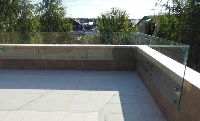 Цельностеклянные перила для эксплуатируемой кровли с креплением в торец балконной плиты