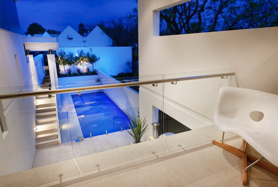 Ограждение с профильным поручнем с пазом на точечном креплении на лестнице