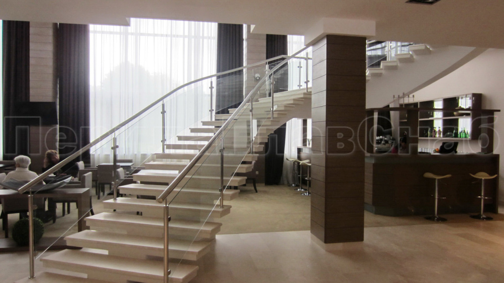Ограждение маршевой межэтажной лестницы в офисном здании, несущее стекло на точечном креплении.